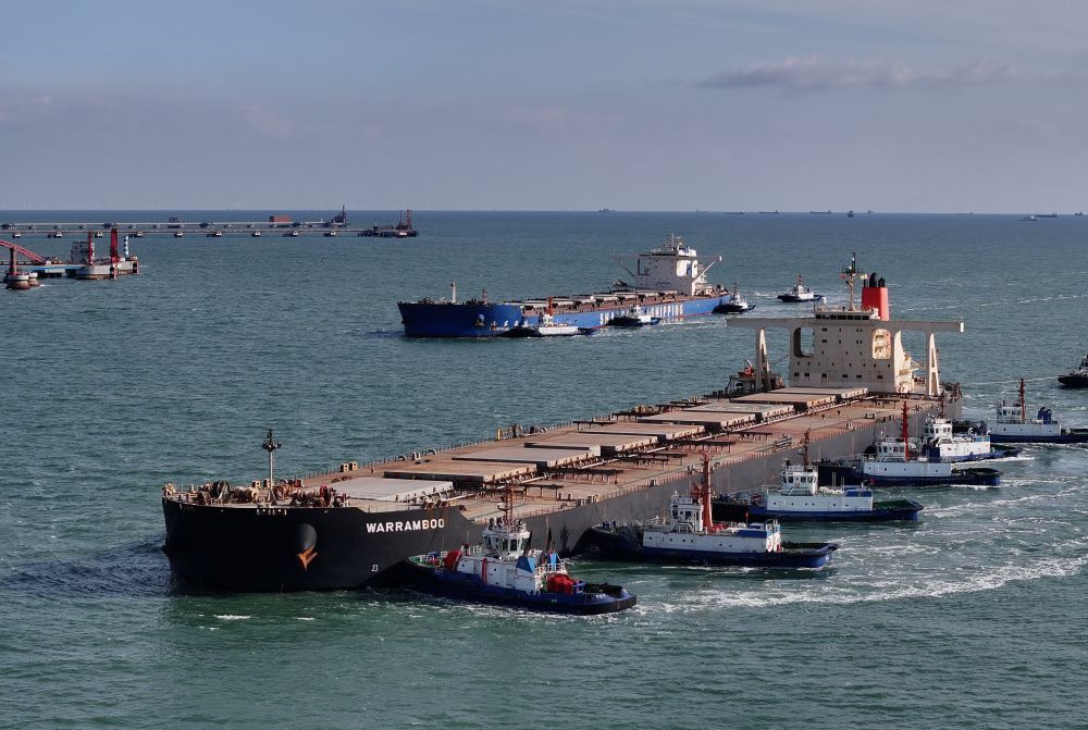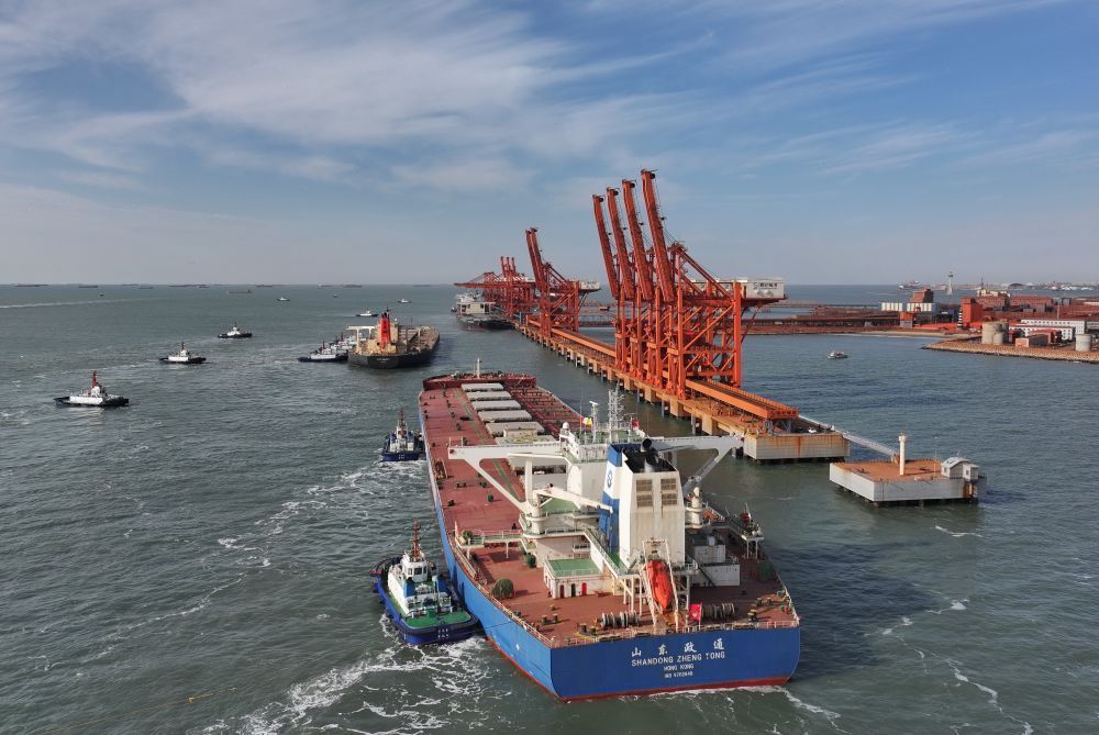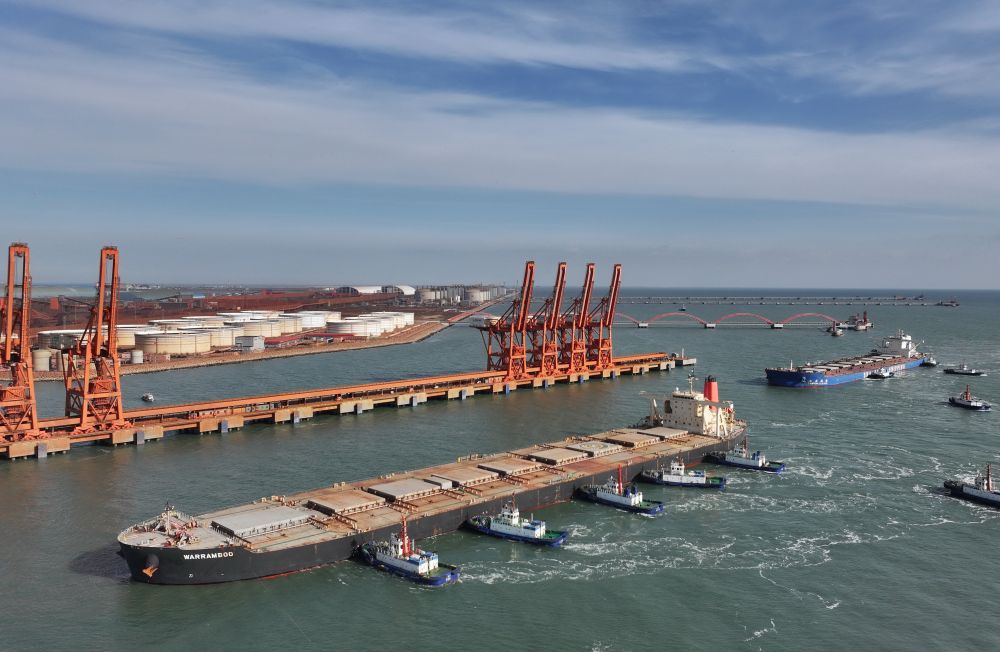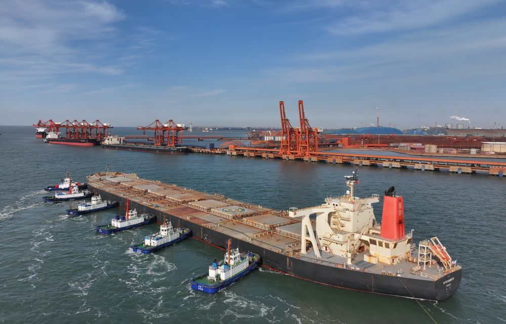 ↑1月13日,两艘轮船在拖轮协助下向唐山港曹妃甸港区矿石码头靠泊(无人机照片)。