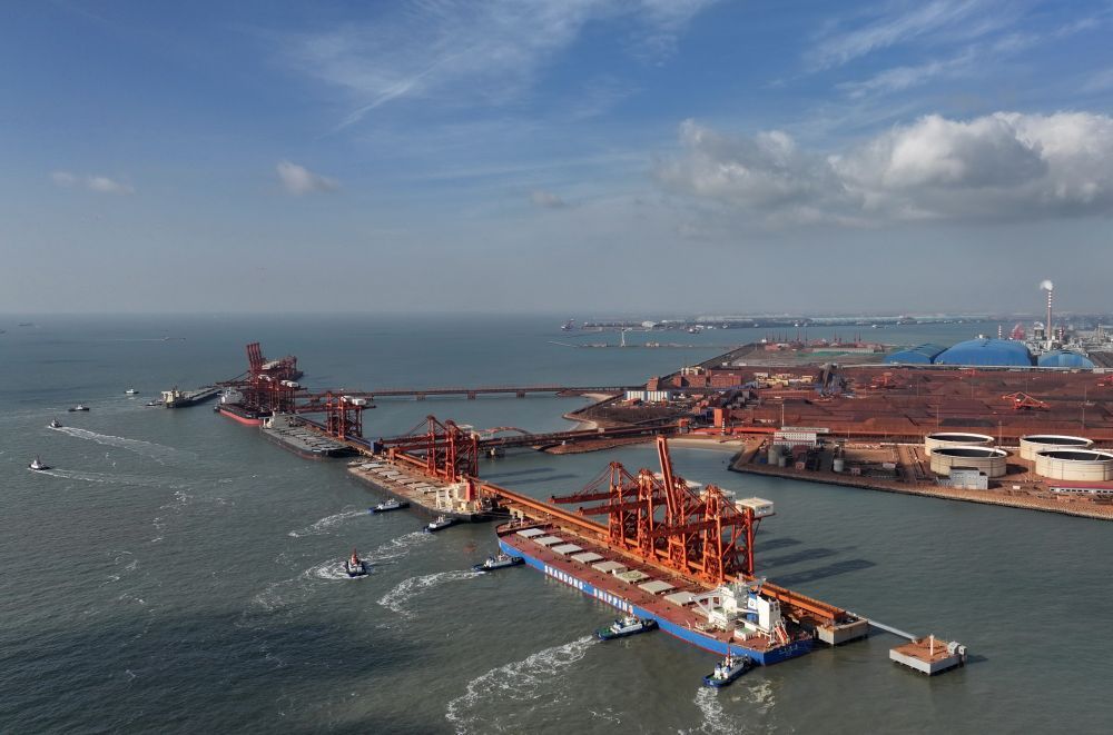 ↑1月13日,靠泊在唐山港曹妃甸港区矿石码头的一艘轮船在卸载(无人机照片)。