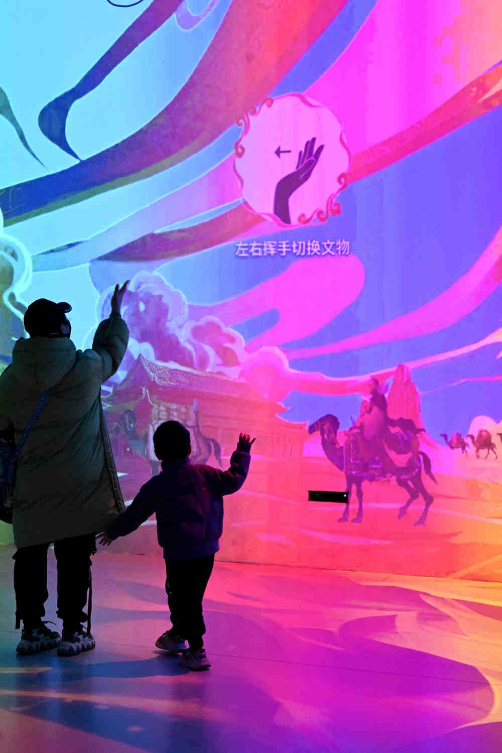 ↑1月13日,小朋友在河北博物院数字互动体验展中体验互动。