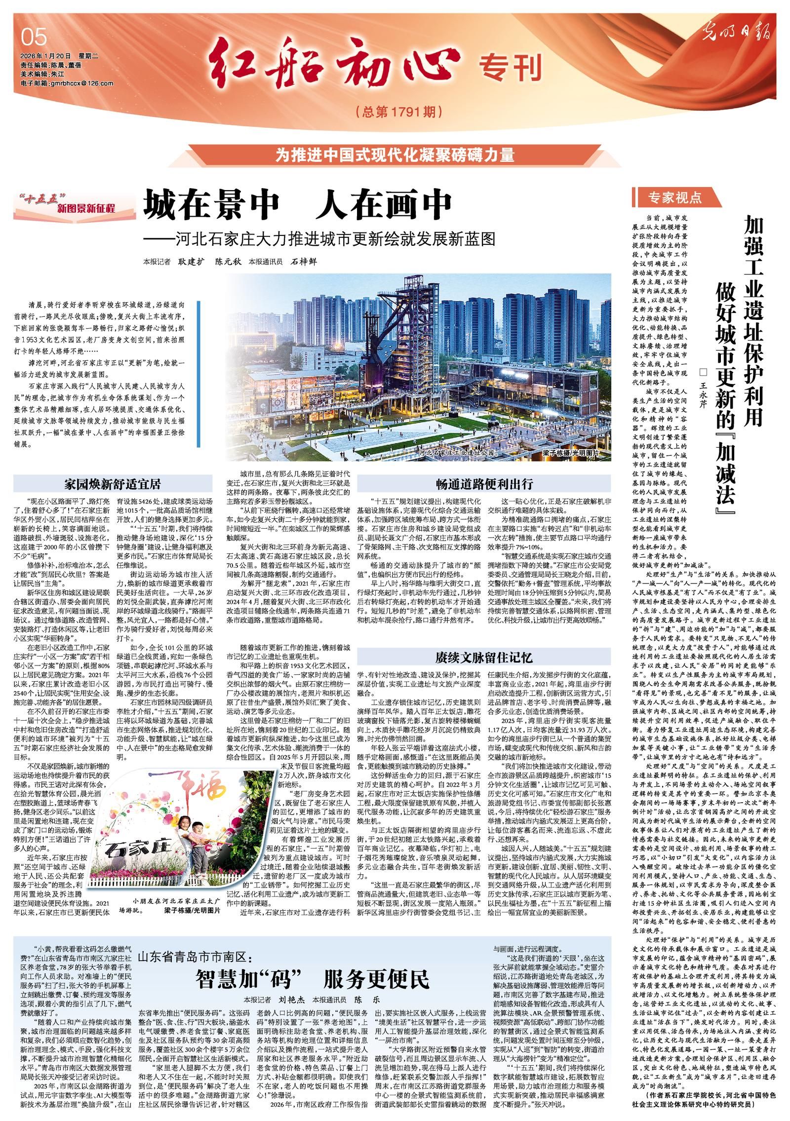城因人兴,人随城美。“十五五”规划建议提出,坚持城市内涵式发展,大力实施城市更新,建设创新、宜居、美丽、韧性、文明、智慧的现代化人民城市。从人居环境蝶变到交通网络升级,从工业遗产活化利用到历史文脉传承,石家庄正以城市更新为笔、以民生福祉为墨,在“十五五”新征程上描绘出一幅宜居宜业的美丽新图景。