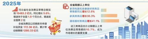 2025年,河北省社会消费品零售总额实现15483.2亿元,同比增长5.6%,增速快于全国1.9个百分点,增速居全国第2位。全省消费品以旧换新共申请补贴资金172.38亿元,累计带动销售额1280.33亿元。