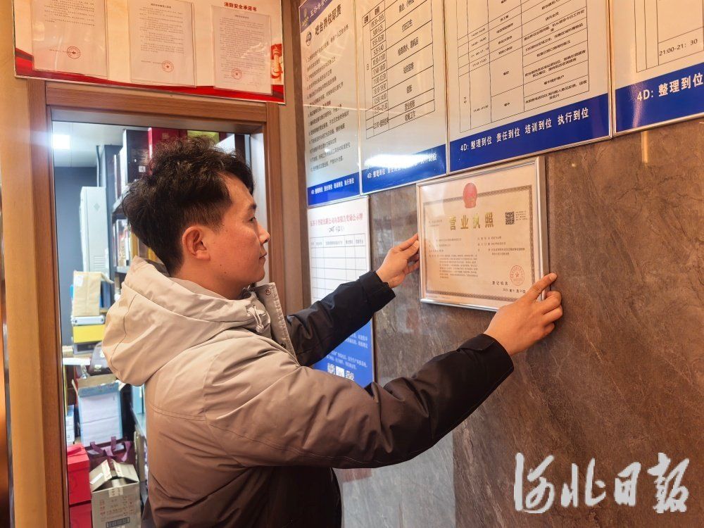 2月11日,“五谷丰登”餐饮店老板朱丽君正在摆放营业执照。河北日报记者解楚楚摄