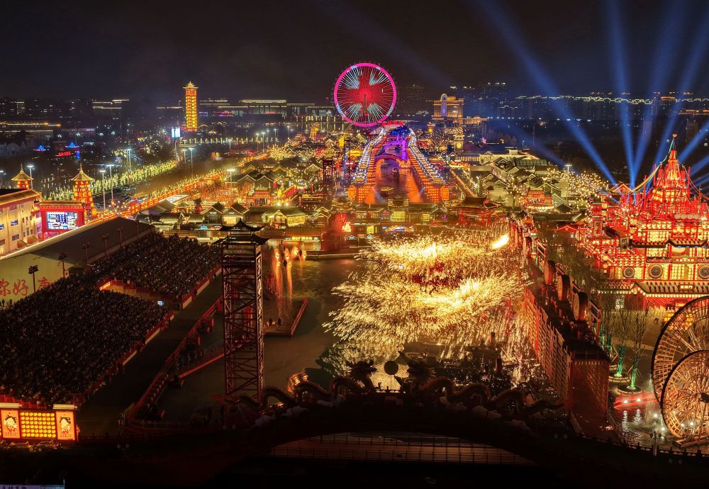 春节期间,河北省唐山市丰南区河头老街灯火璀璨、火树银花,为游客呈现出一场流光溢彩的视觉盛宴。