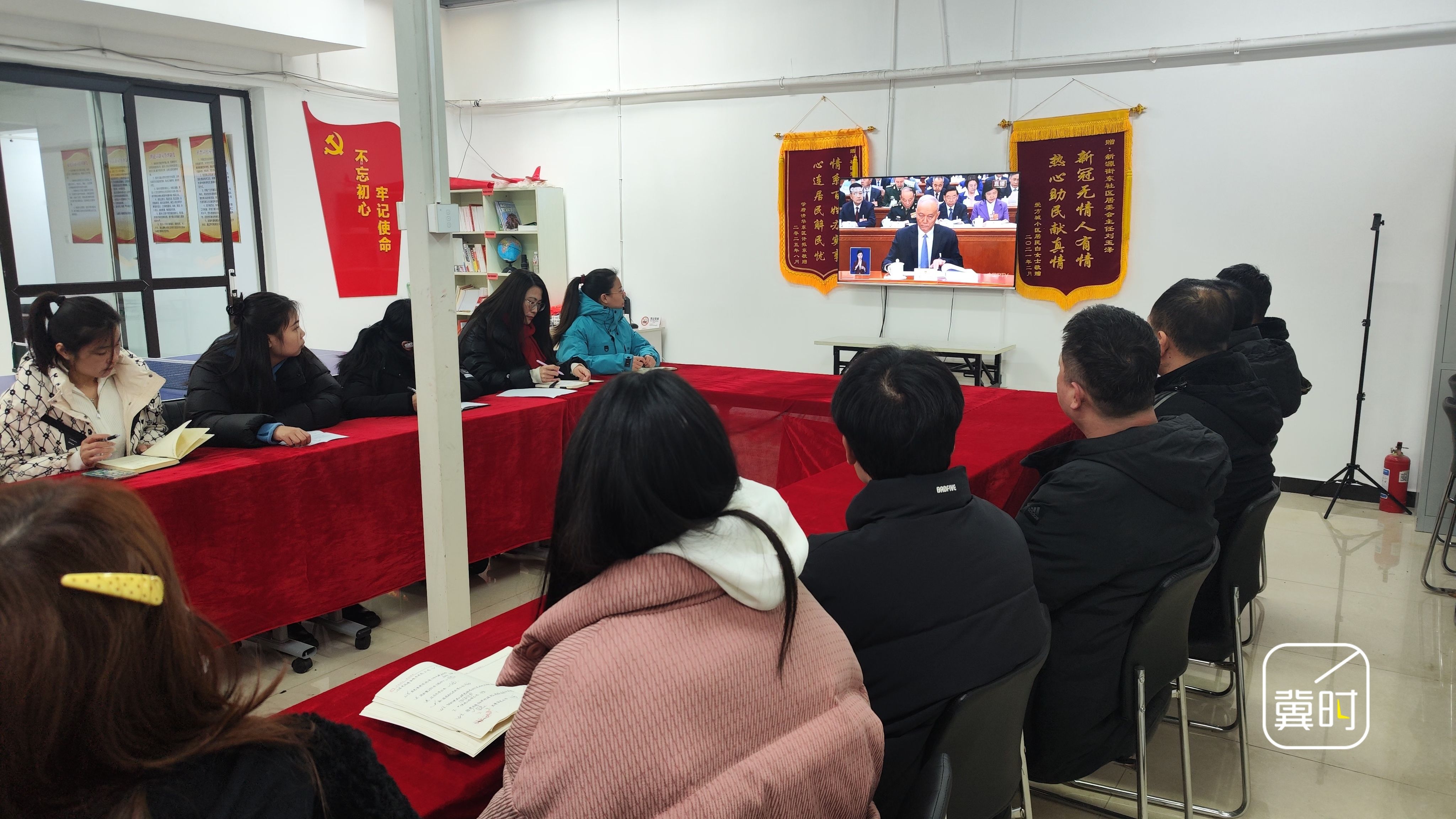 秦皇岛经开区珠江道街道天成锦江苑社区组织干部职工集中收看开幕会直播实况,聆听《政府工作报告》。(河北台 张志刚 米弘钊 赵永鑫 李泽群 通讯员 梁爽 彭云飞)