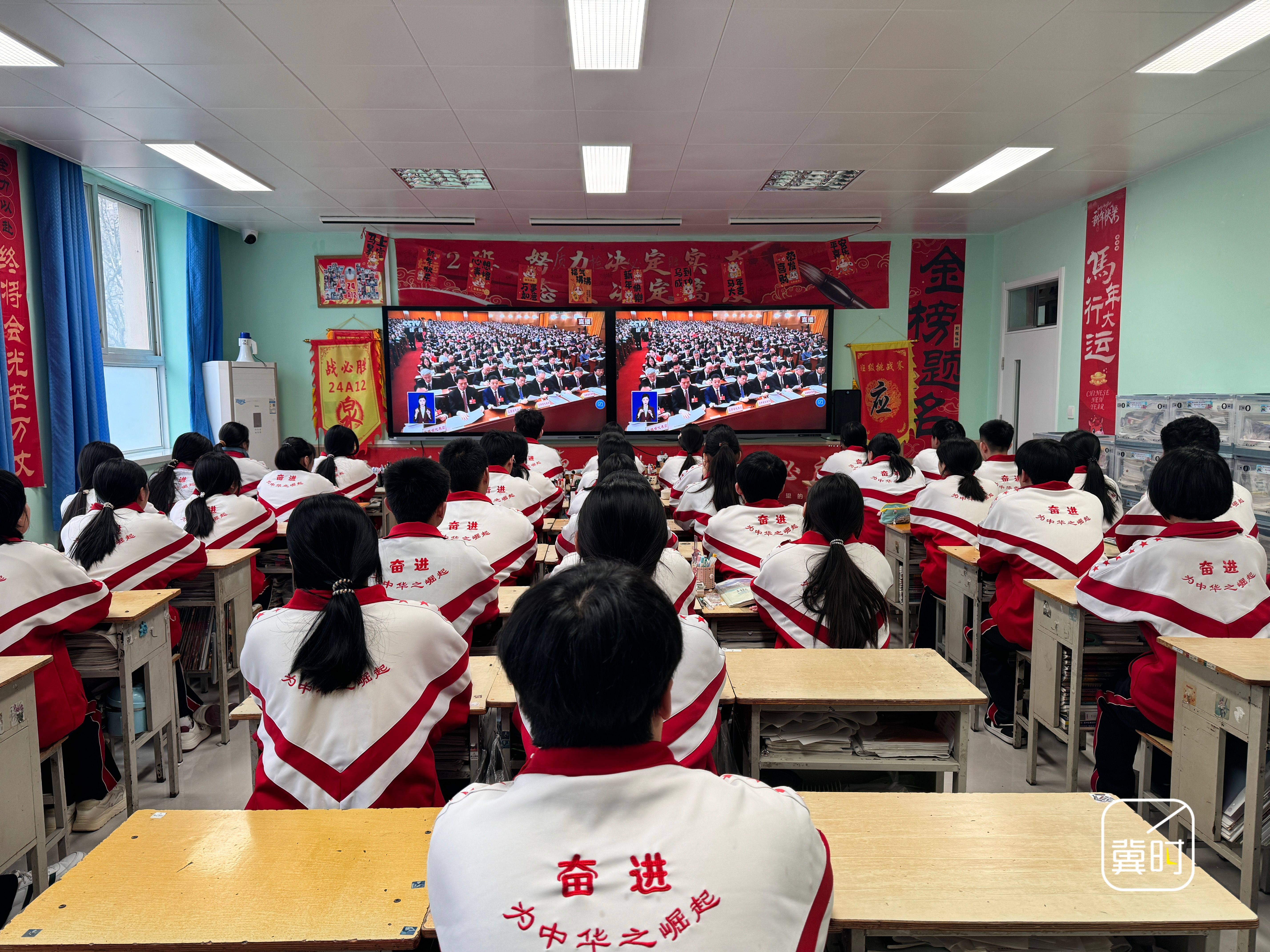 衡水市第十三中学师生集中收看十四届全国人大四次会议开幕会直播实况,认真聆听《政府工作报告》。(河北台 王美中 田默涵 李宝伟)