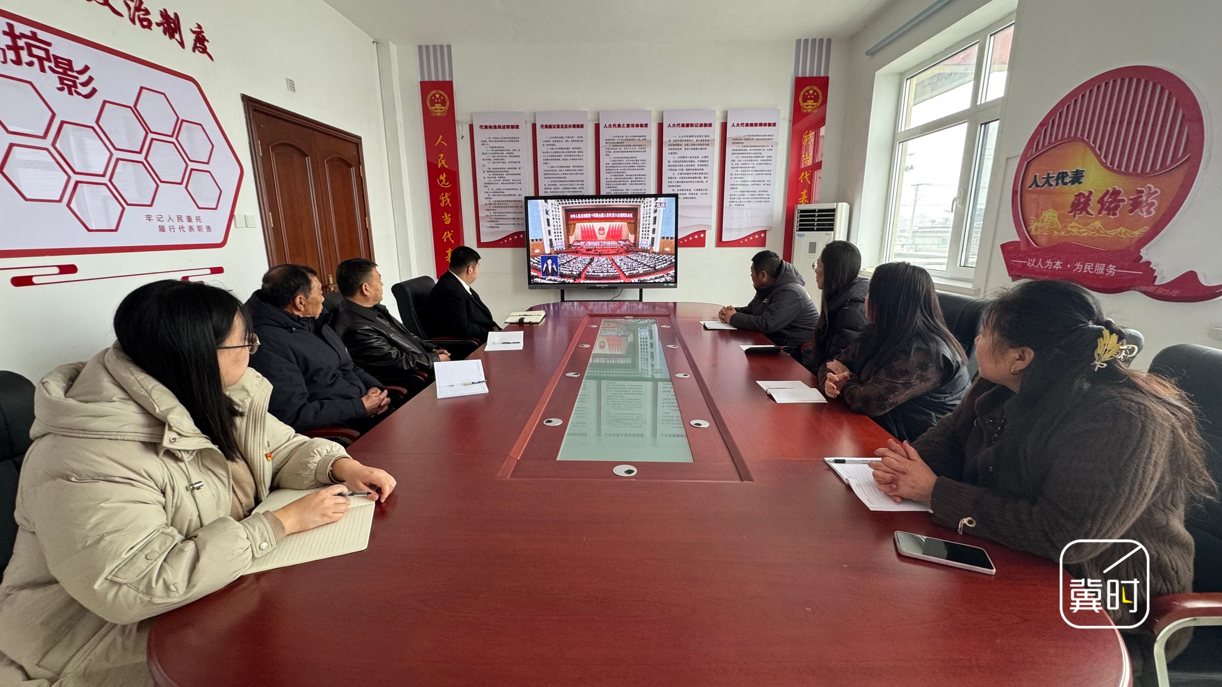 在唐山市丰润区丰润镇王家楼村会议室内,镇、村党员干部、村民代表围坐一堂,集中观看十四届全国人大四次会议开幕式直播。(河北台 陈维威 石博宇 桑源 通讯员 魏巍)