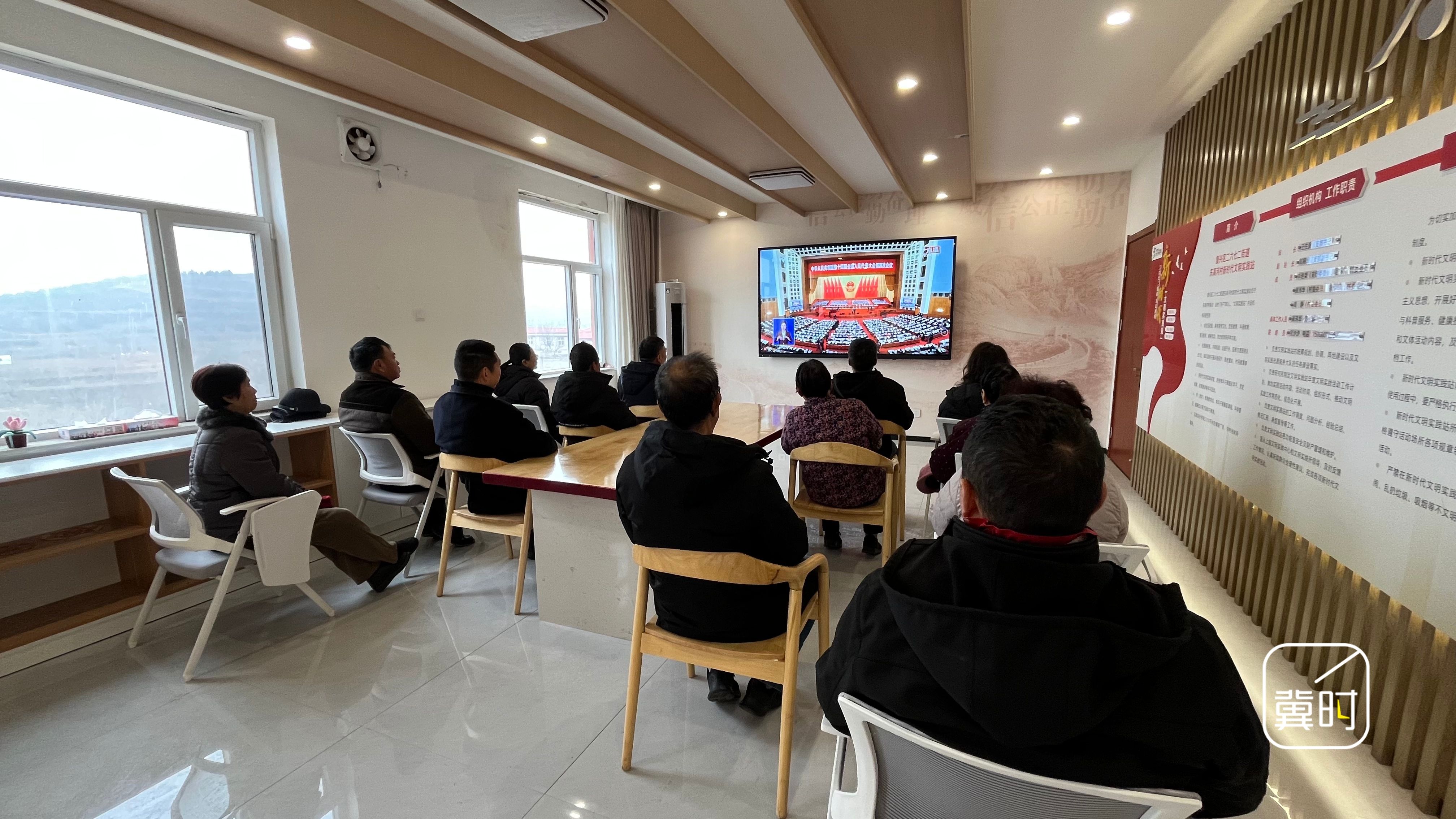 石家庄市正定县塔元庄村党员干部、村民代表集中收看十四届全国人大四次会议开幕会实况。(河北台 杜岩卿 郭晓杰)