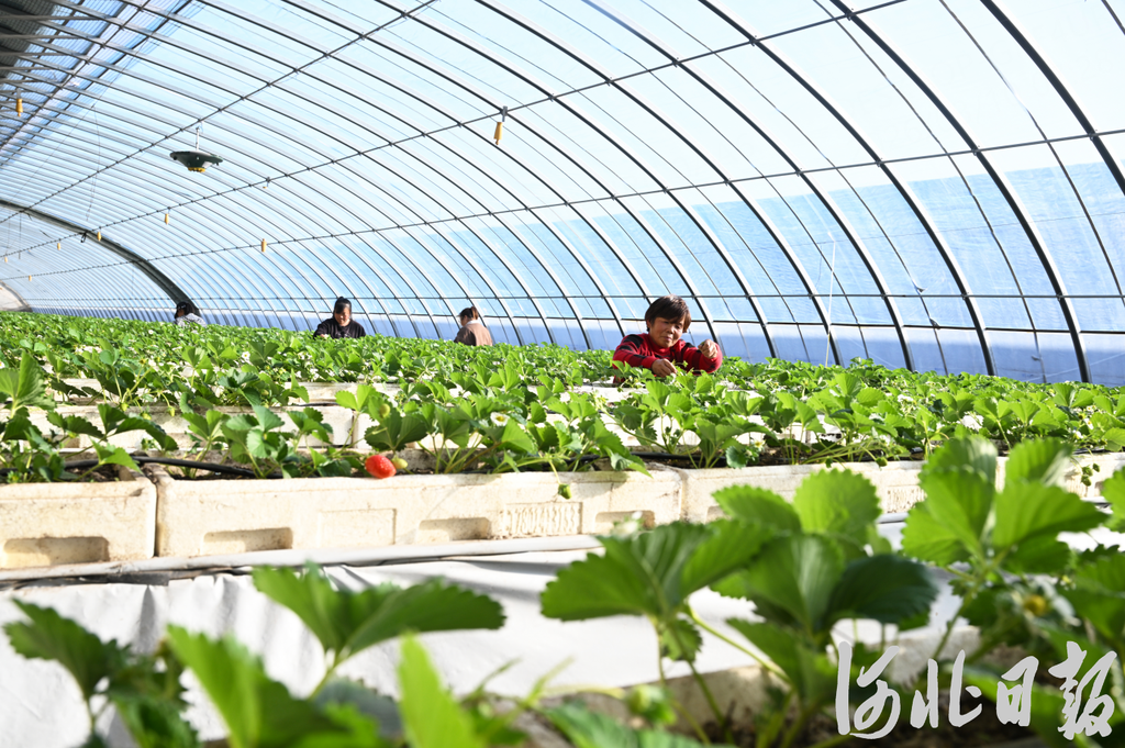 近日,在永清县海泽田现代农业园区,农民管护基质栽培架上的草莓。(资料片)河北日报记者赵永辉摄