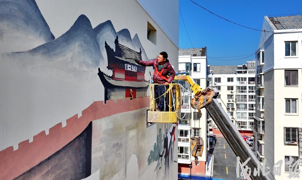 2025年11月3日,秦皇岛市海港区红光北里社区,工人在进行墙体彩绘。河北日报记者 赵杰摄