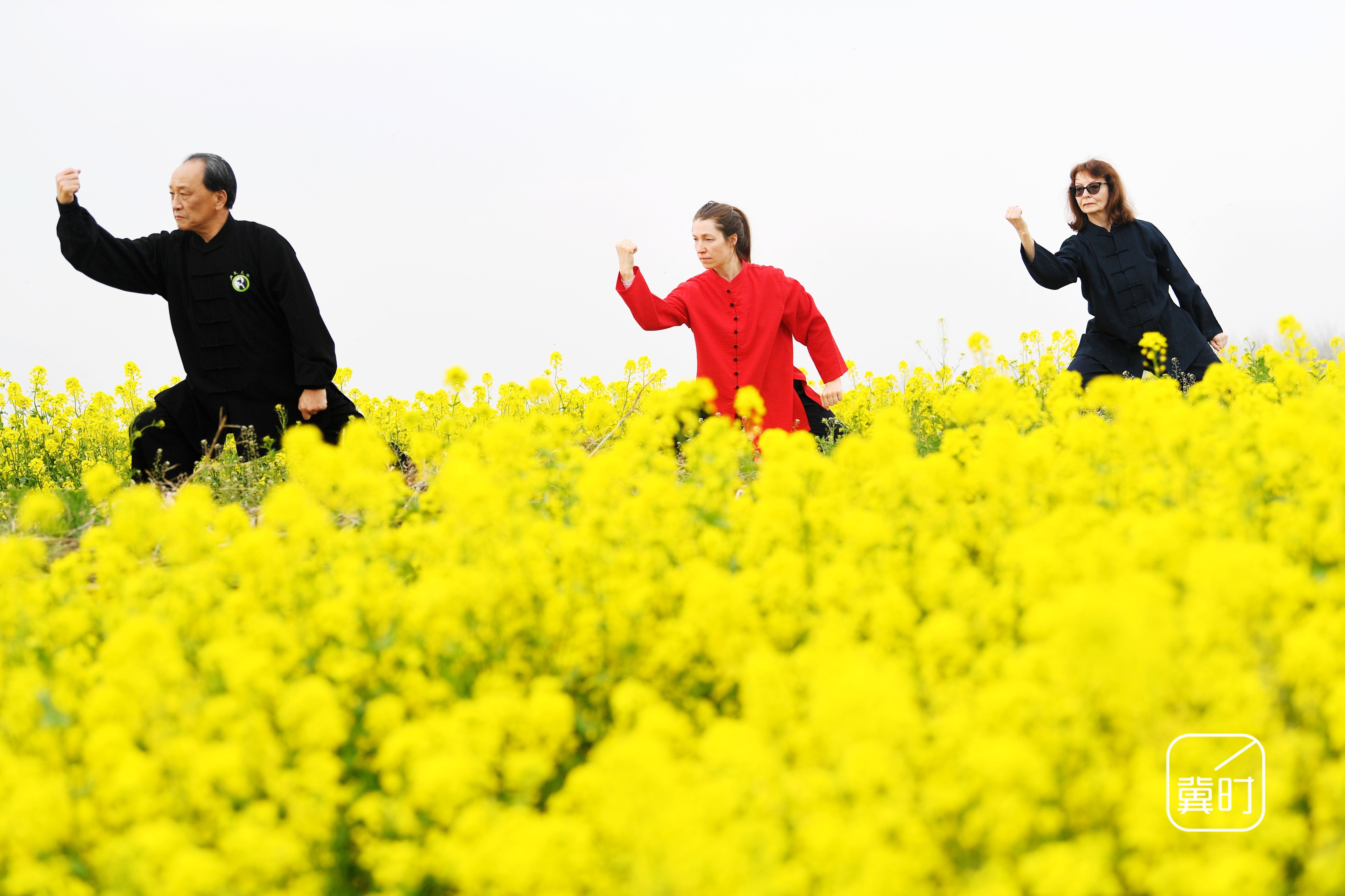 3月31日,在河北省广平县万亩油菜花种植基地,俄罗斯游客在花海中练习太极拳。