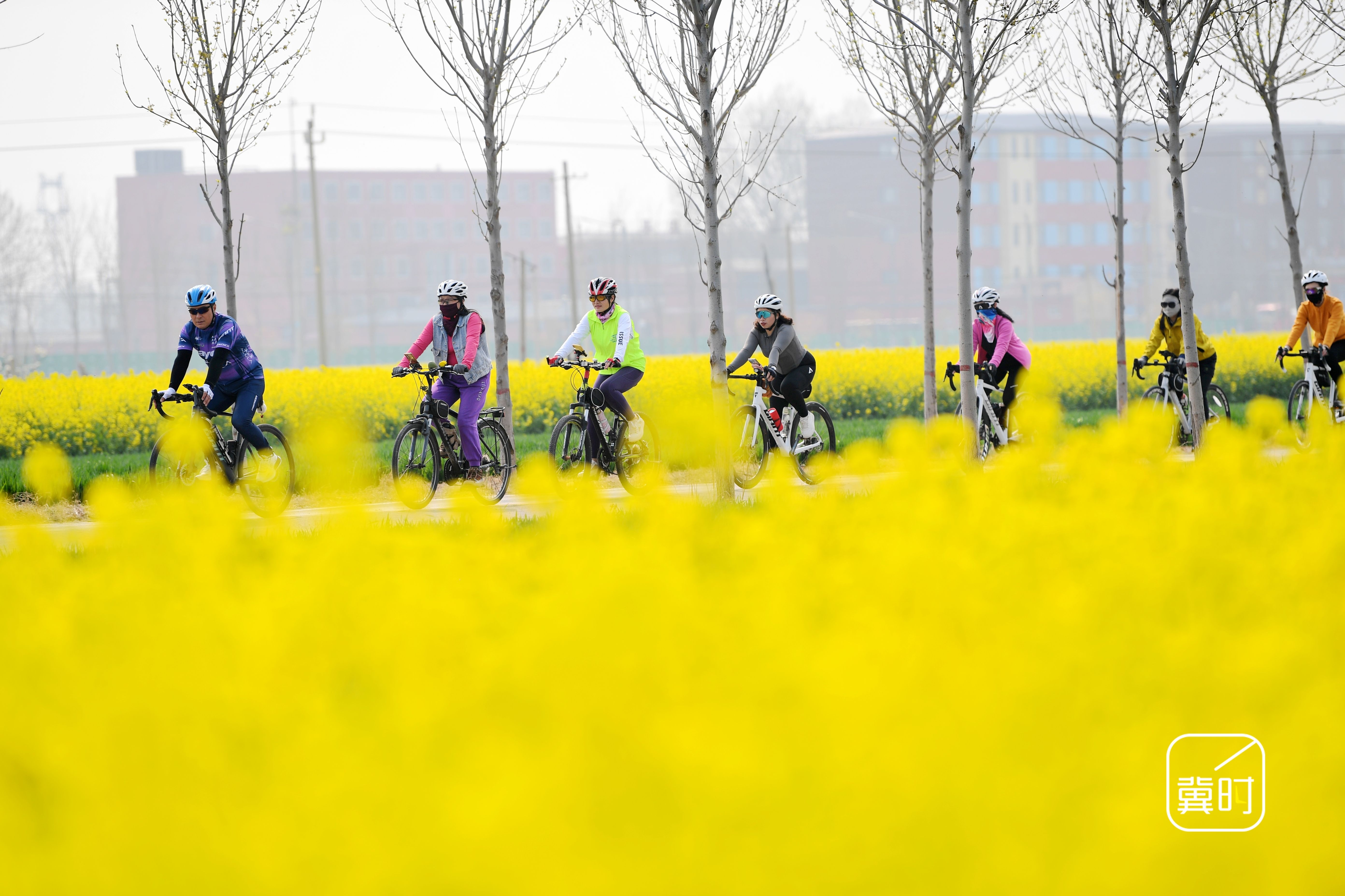 3月31日,在河北省广平县万亩油菜花种植基地,骑行爱好者在花海中穿梭。