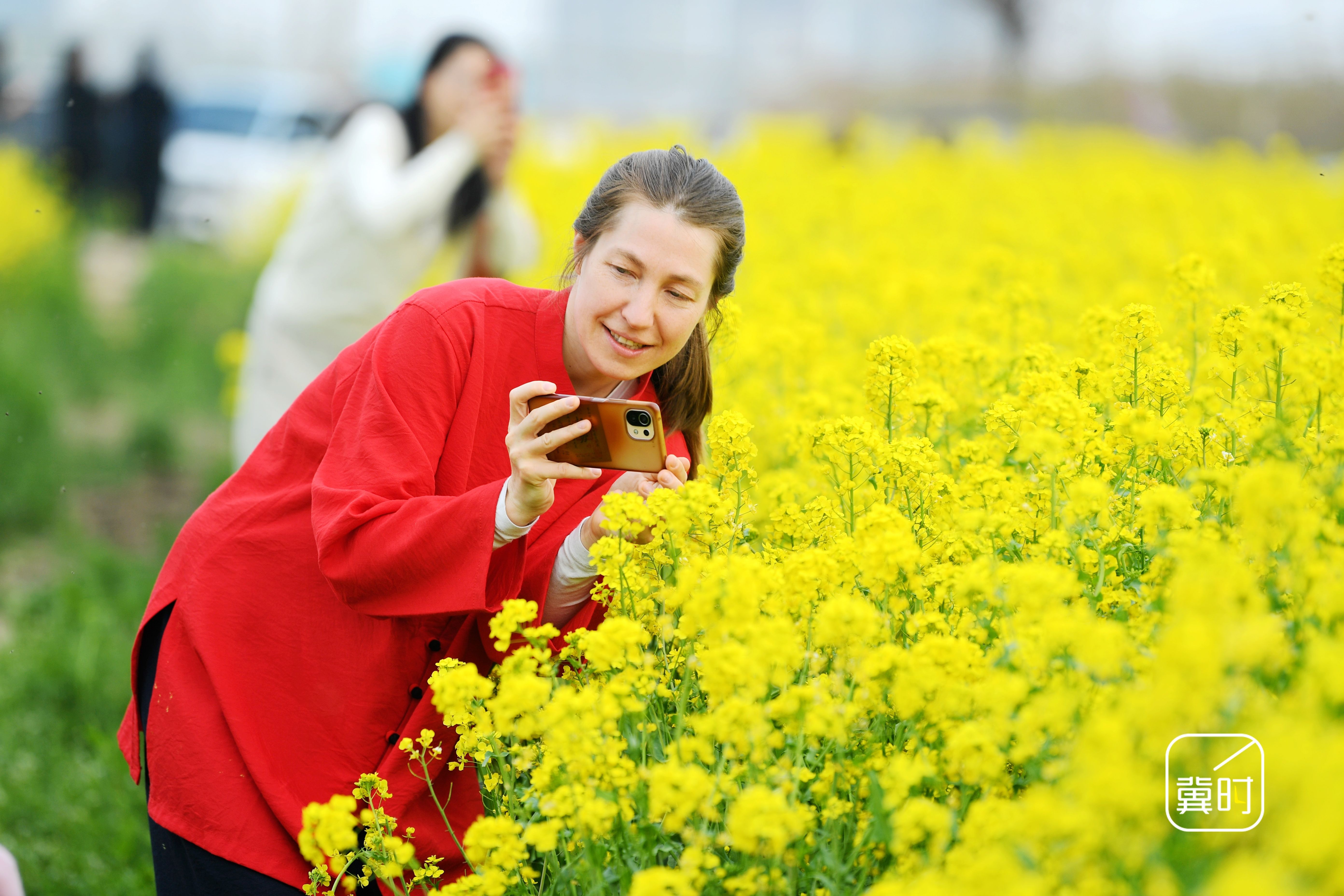 3月31日,在河北省广平县万亩油菜花种植基地,俄罗斯游客在花海中游玩。