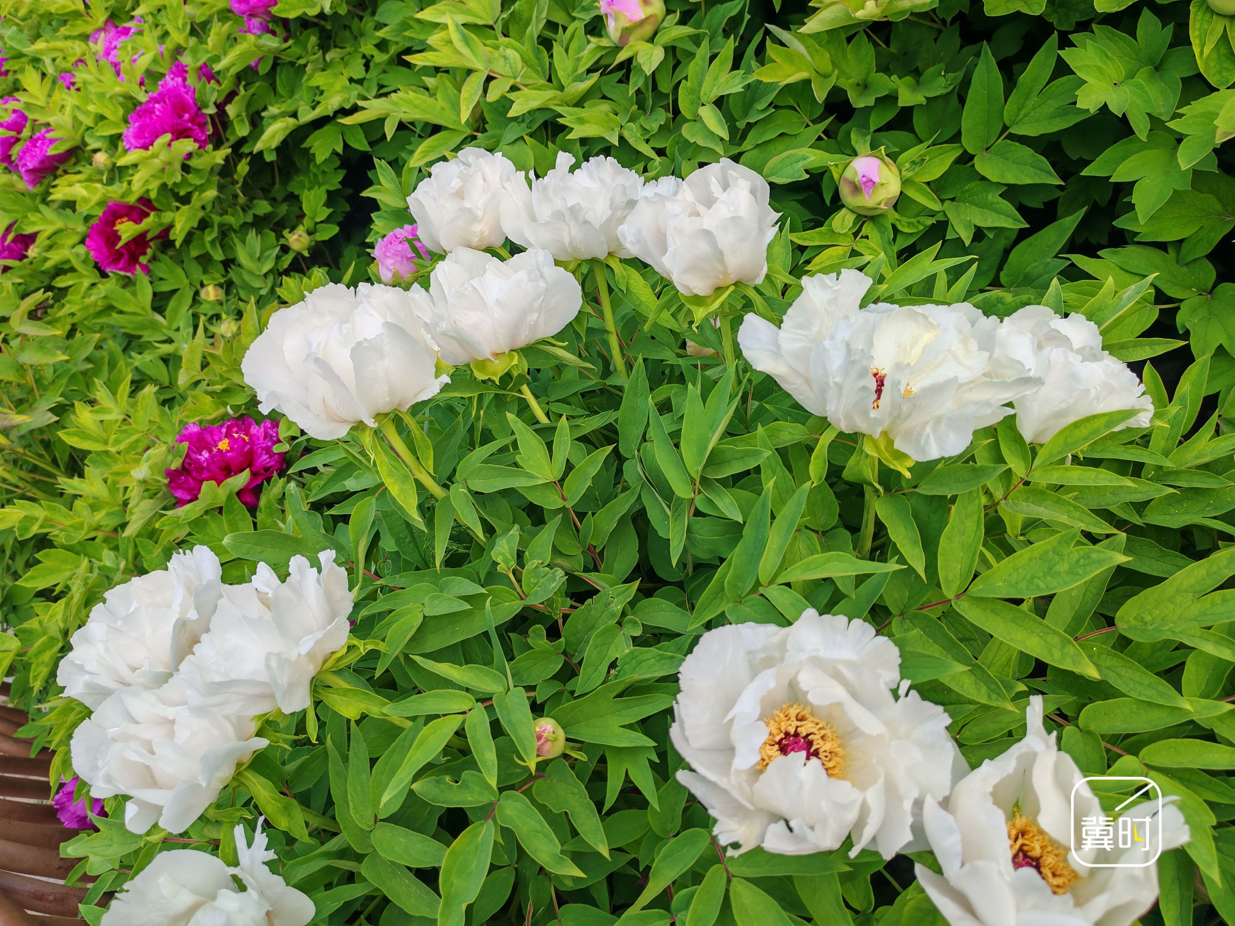 除了艳丽的紫红色,白色牡丹同样成为园内的亮点。洁白的花瓣轻薄通透,搭配嫩黄花蕊,素雅中透着雅致,与周边的紫红色牡丹形成鲜明对比,丰富了视觉层次。