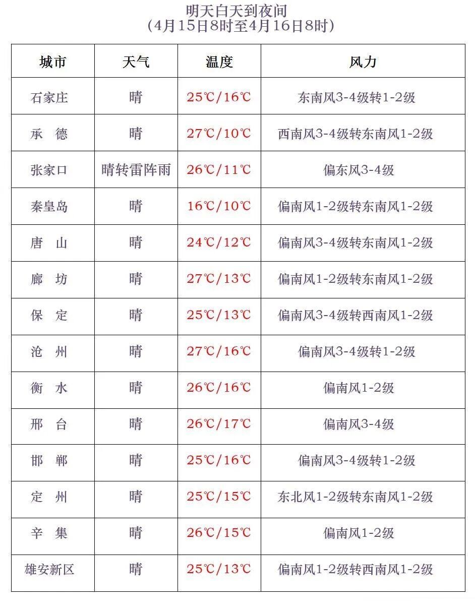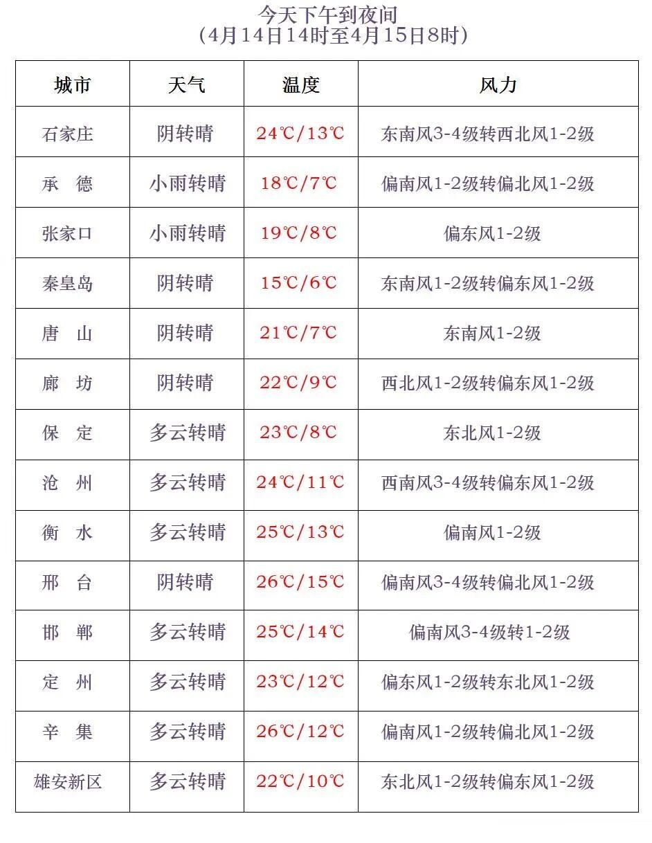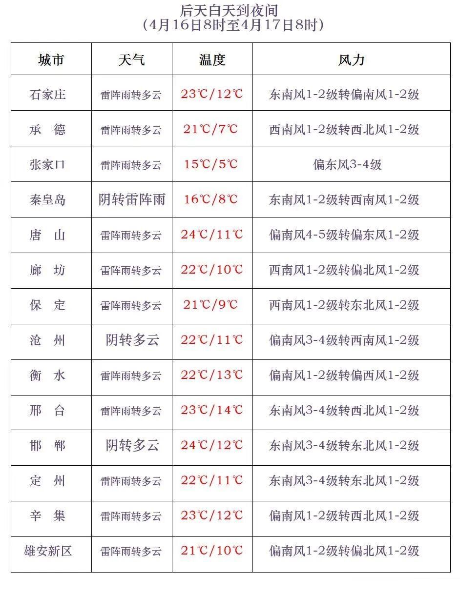 今天下午到夜间,保定、廊坊以北地区和石家庄、邢台、邯郸三个地区的西部阴有雷阵雨或阵雨转晴,其他地区多云转晴。
