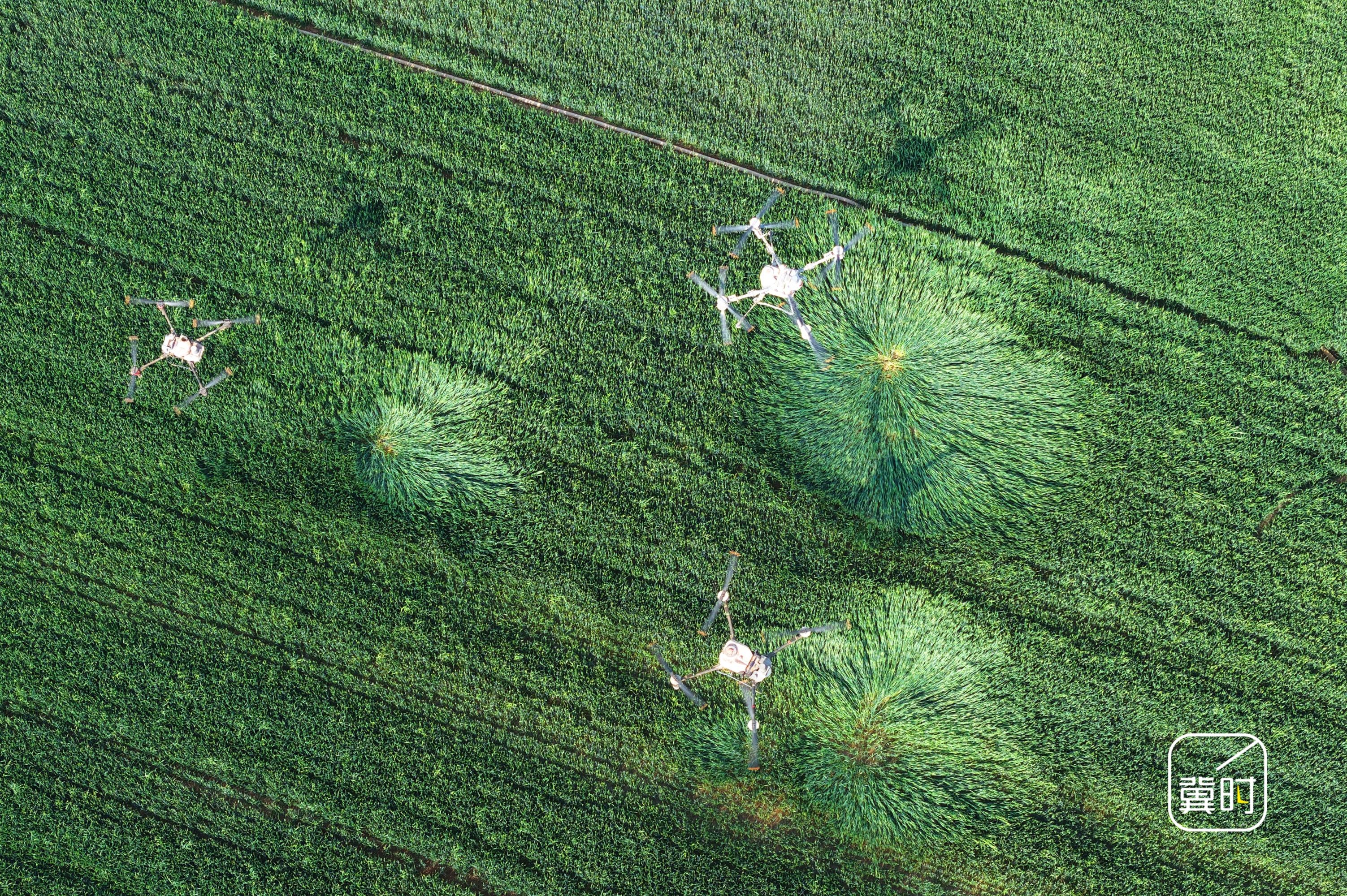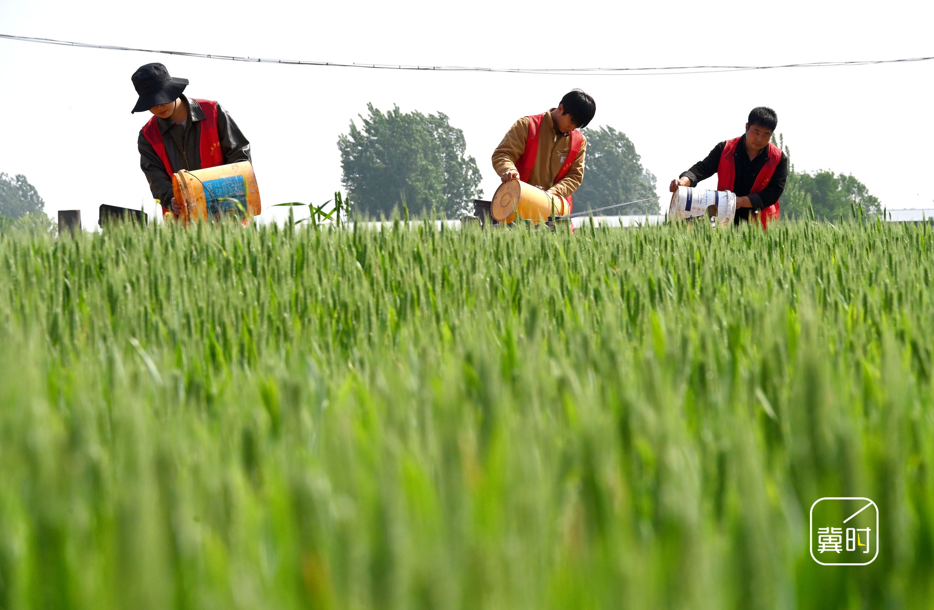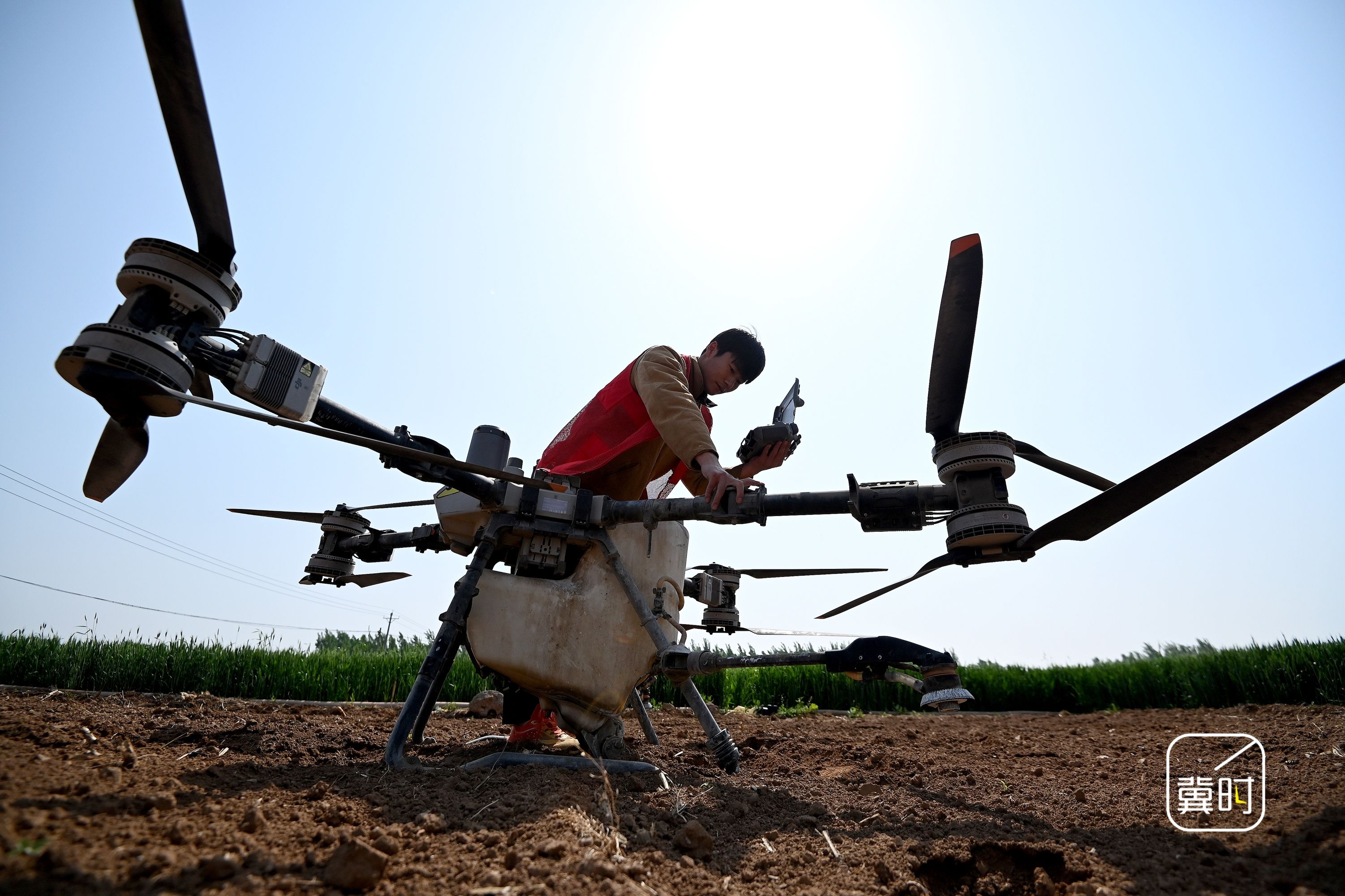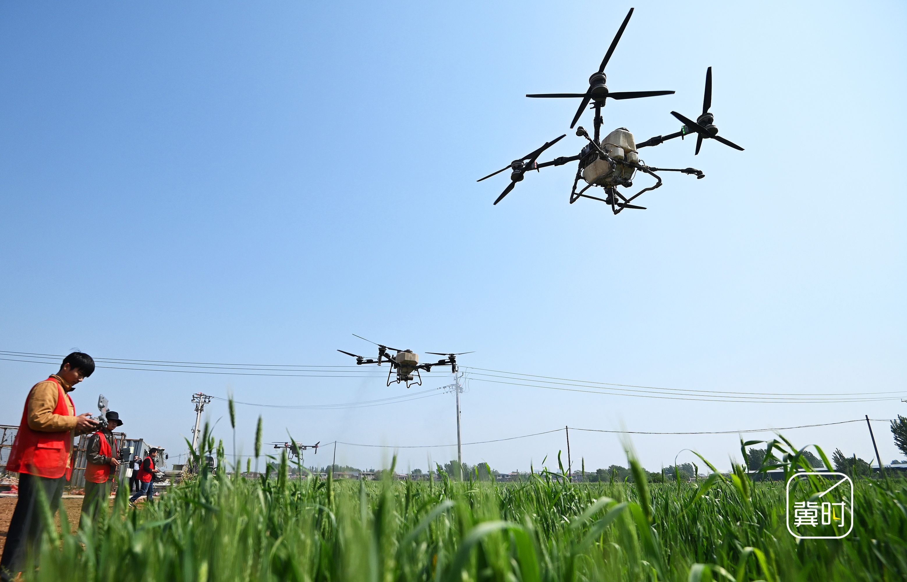 4月24日,在河北省邯郸市邯山区代召乡东王庄村,无人机操作手在操控植保无人机对小麦进行“一喷三防”作业。