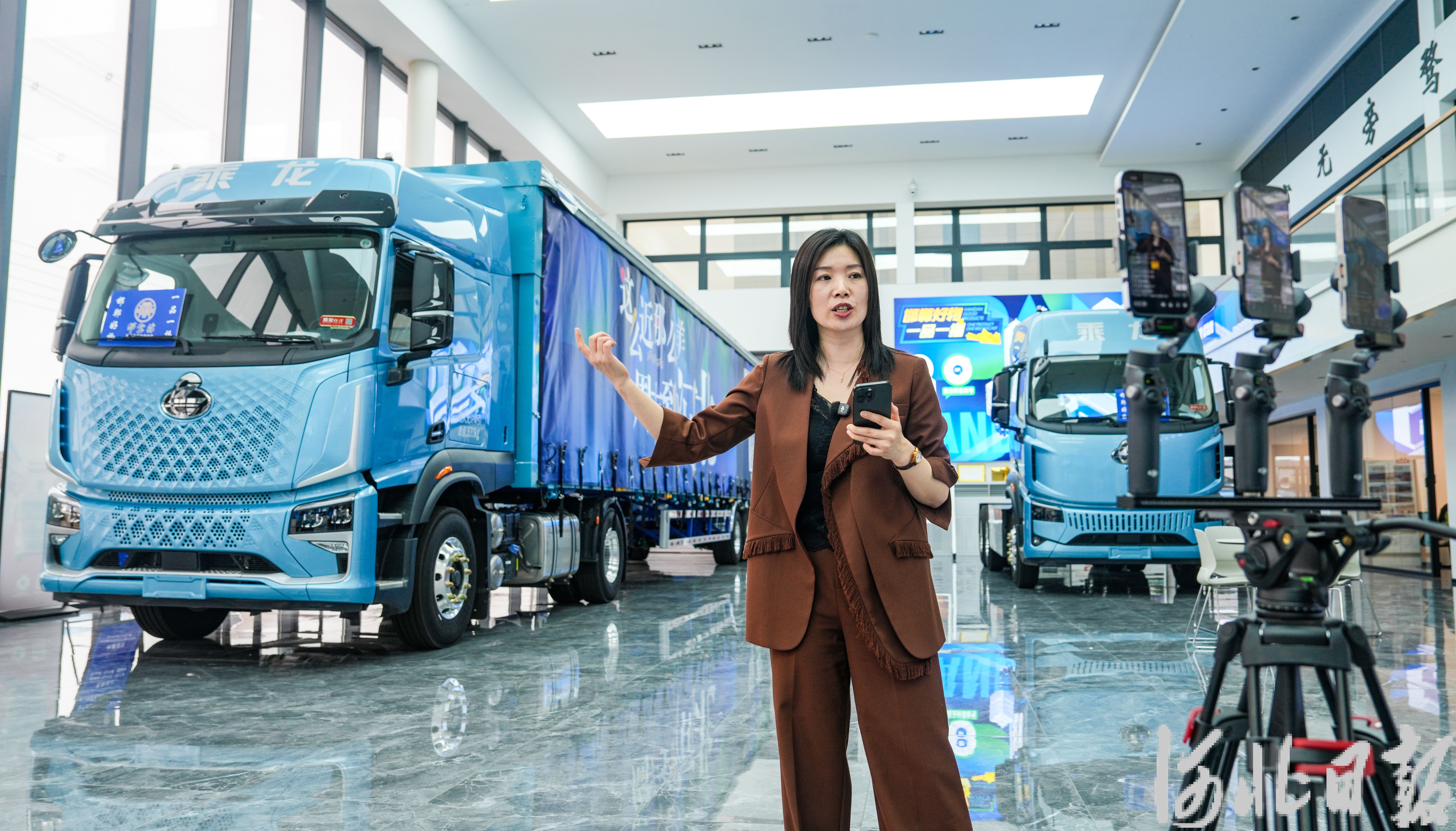4月22日,位于成安县的河北伯昂汽车销售服务有限公司,主播武然然在直播销售定制化货车。 河北日报记者 李东宇摄