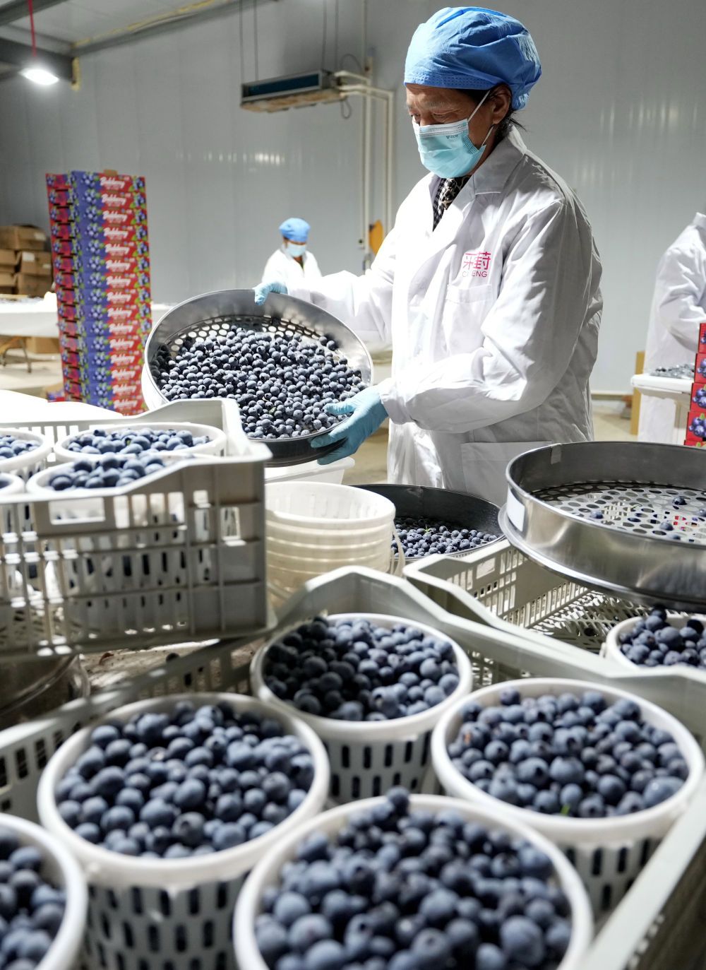 ↑4月27日,河北省卢龙县胜行家庭农场的工人在分拣蓝莓。