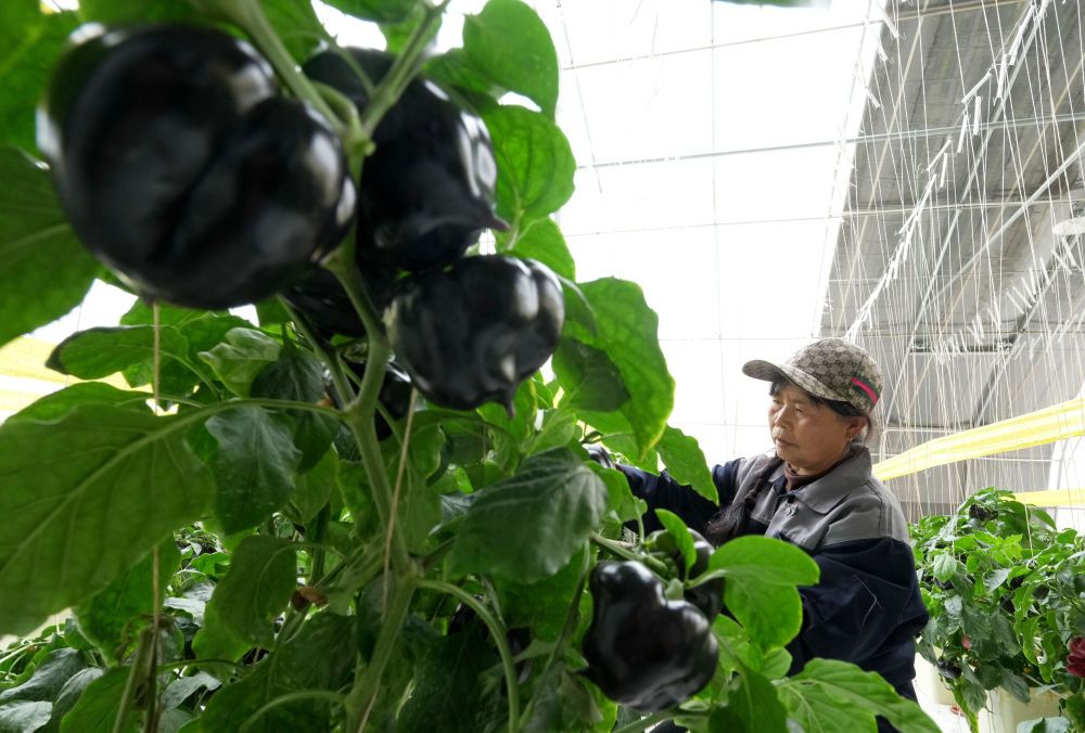 ↑4月27日,农民在河北省卢龙县木井镇蔬菜种植基地的大棚内管护黑色辣椒。