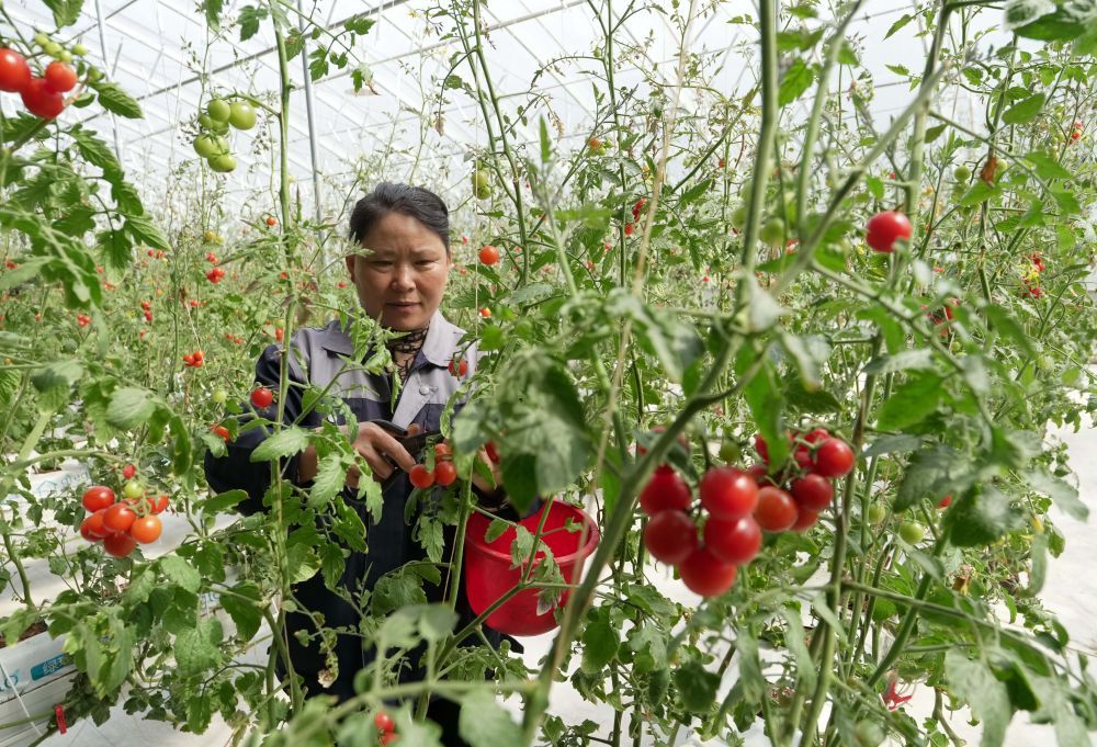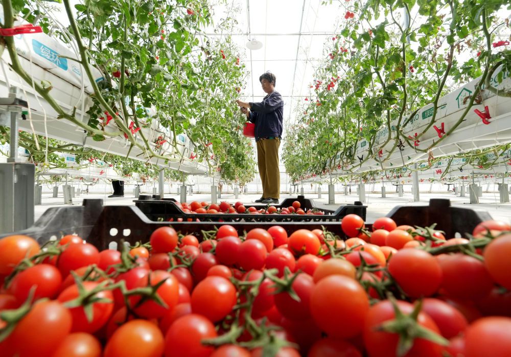 ↑4月27日,农民在河北省卢龙县木井镇蔬菜种植基地的大棚内采摘西红柿。