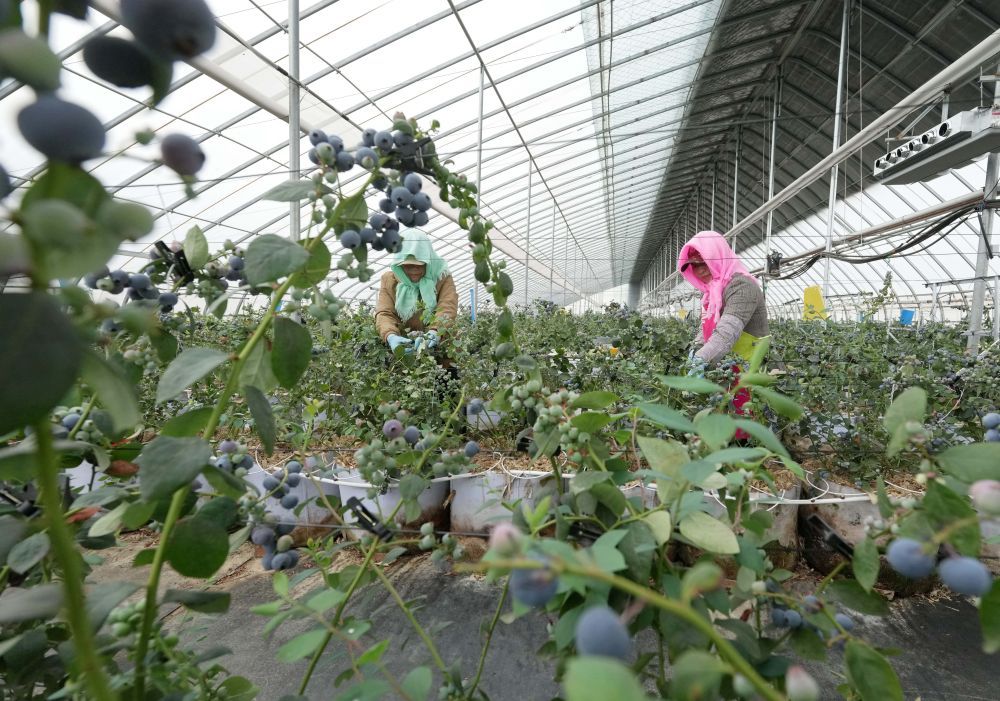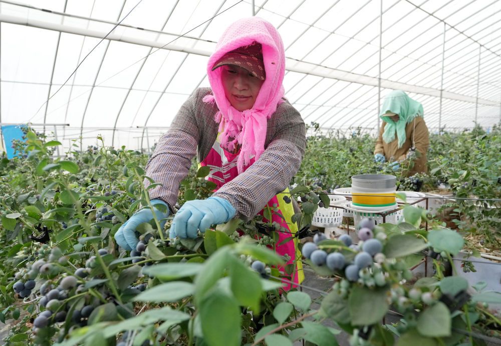 ↑4月27日,河北省卢龙县胜行家庭农场的工人在大棚内采摘蓝莓。