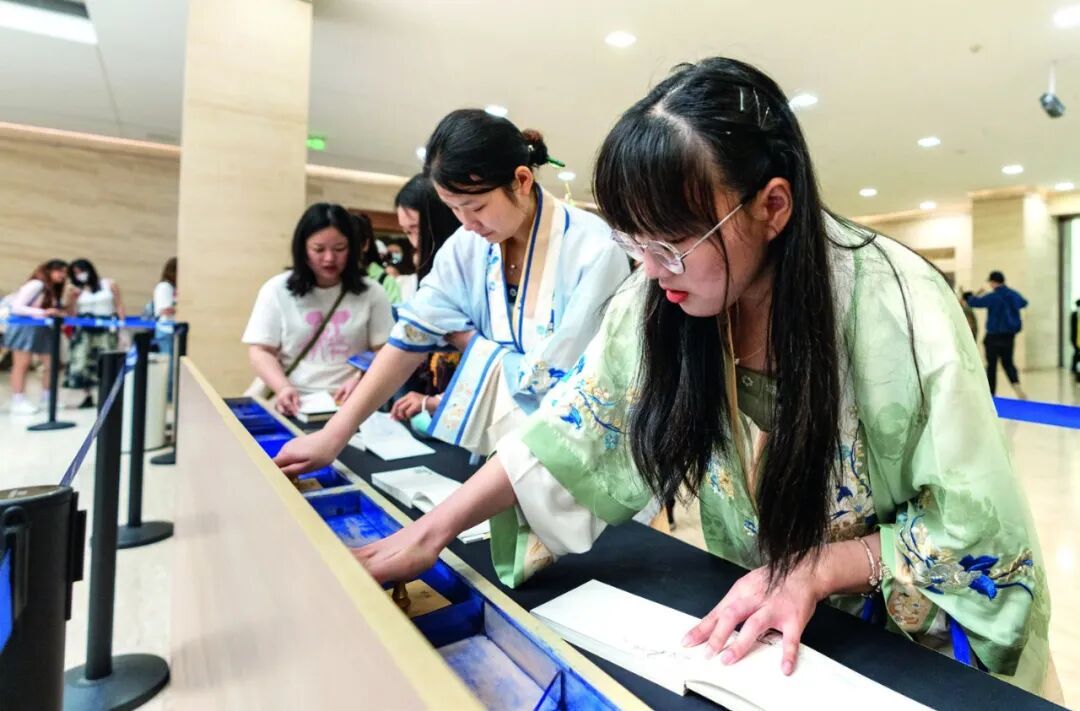 文化游、研学游、“慢旅游”逐渐成为年轻人热衷的旅行方式。图为游客在南京博物院盖章打卡。(杜懿/人民图片)