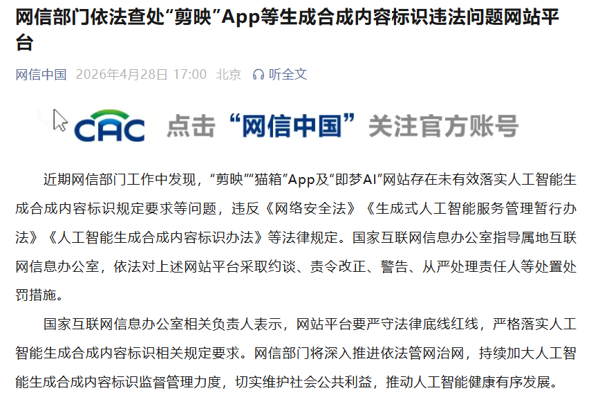 近期网信部门工作中发现,“剪映”“猫箱”App及“即梦AI”网站存在未有效落实人工智能生成合成内容标识规定要求等问题,违反《网络安全法》《生成式人工智能服务管理暂行办法》《人工智能生成合成内容标识办法》等法律规定。国家互联网信息办公室指导属地互联网信息办公室,依法对上述网站平台采取约谈、责令改正、警告、从严处理责任人等处置处罚措施。