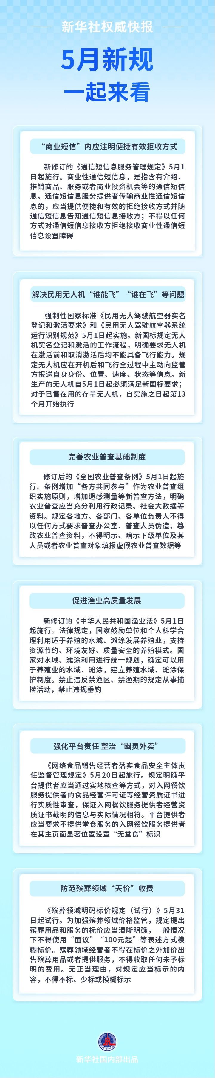 规定“商业短信”内应注明便捷有效拒收方式;解决民用无人机“谁能飞”和“谁在飞”等问题;完善农业普查基础制度……5月新规,一起来看。
