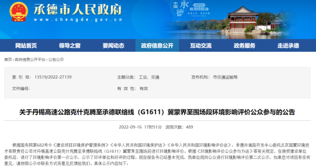 公示的环评报告显示,“丹锡高速公路克什克腾至承德联络线(G1611)冀蒙界至围场段”项目工程,起于河北与内蒙古交界处与克承高速(内蒙段)顺接,所经乡镇包括承德市围场满族蒙古族自治县塞罕坝机械林场、御道口牧场、御道口镇、城子镇、牌楼乡、半截塔镇、道坝子乡、龙头镇、围场镇,终点在围场满族蒙古族自治县城北、大广高速公路围场支线终点。