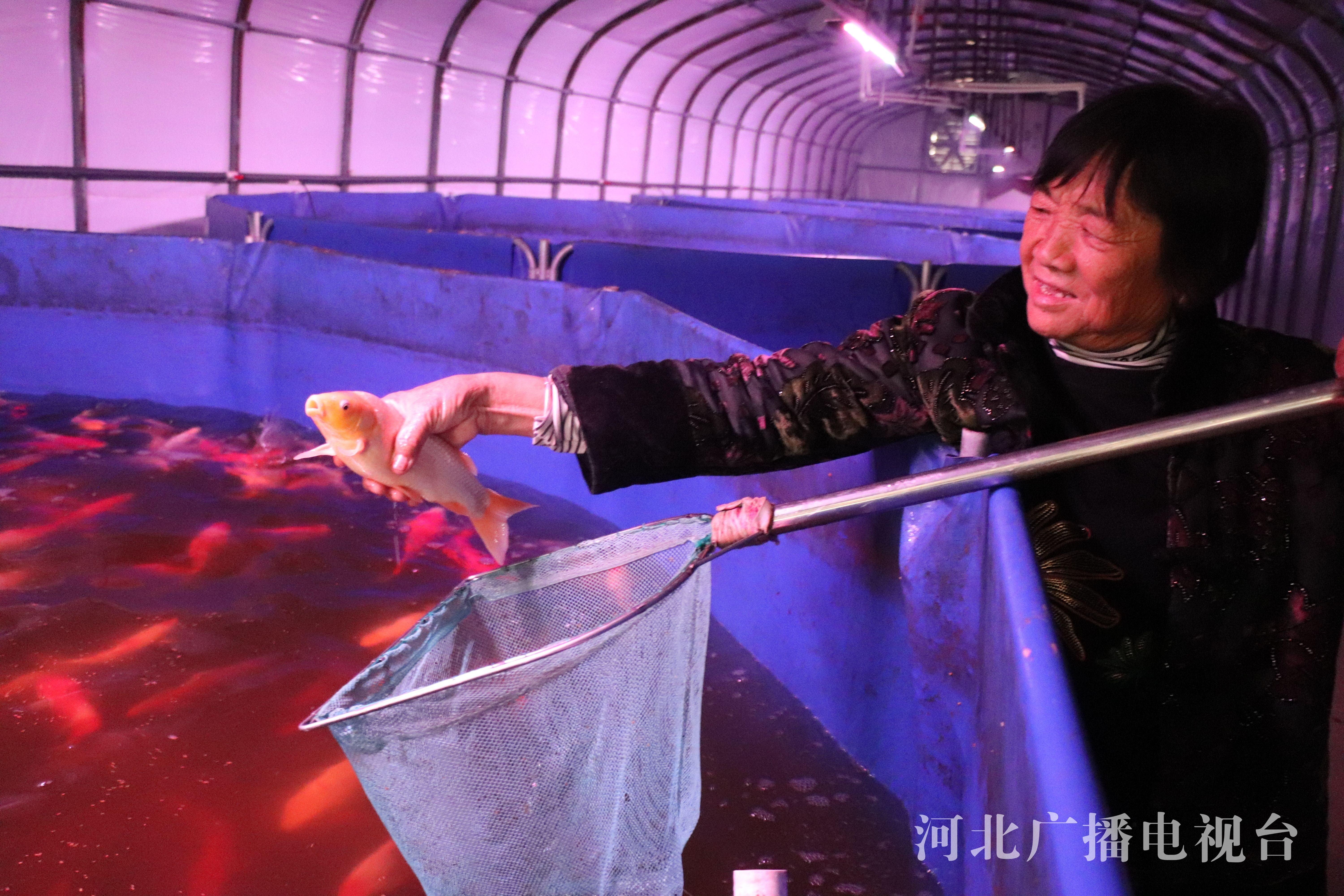 广平县金安村现代农业园“鱼菜共生生态种养”基地内农户在查看锦鲤生长情况。