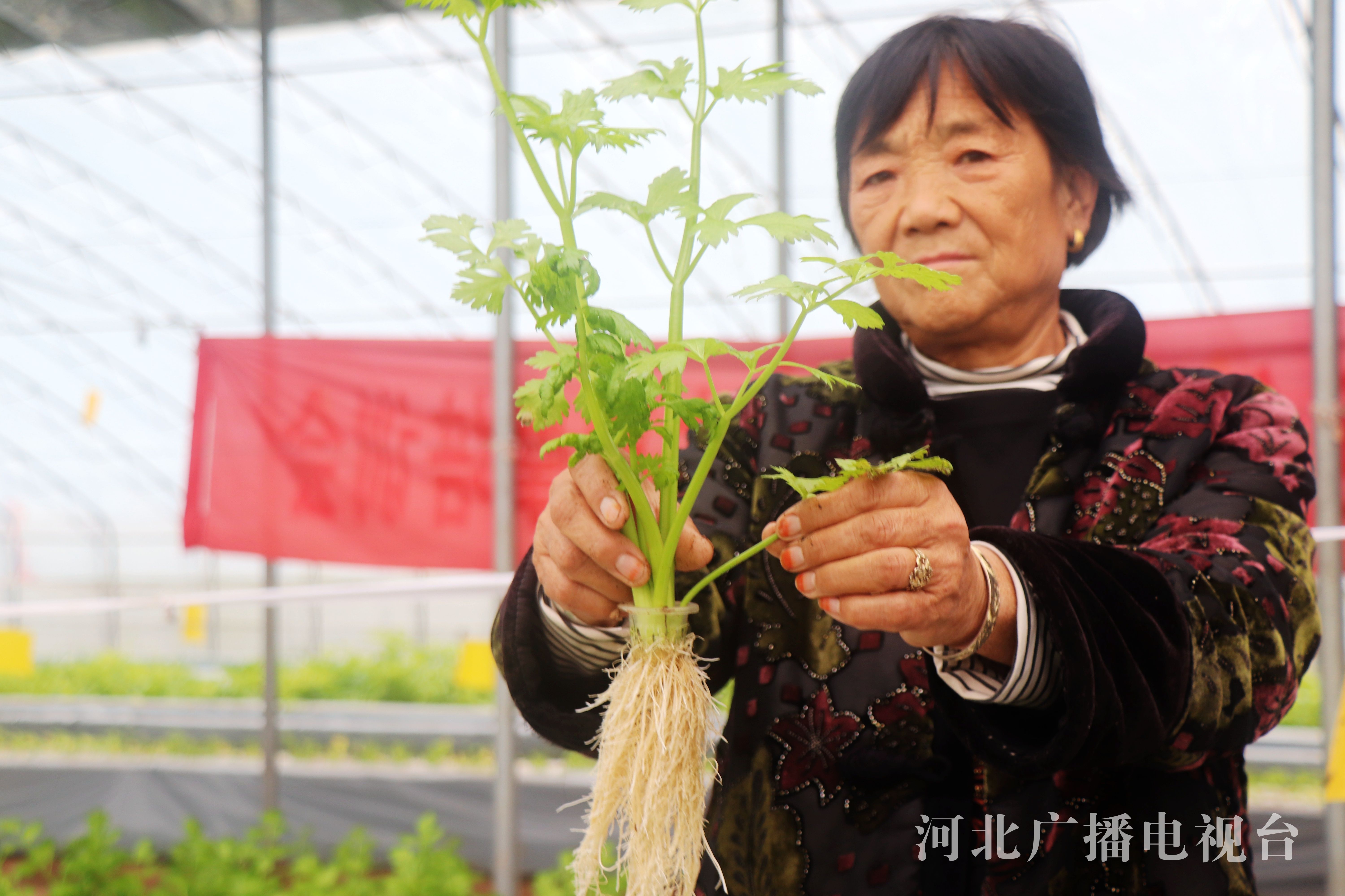 广平县金安村现代农业园“鱼菜共生生态种养”基地内农户展示水生蔬菜。