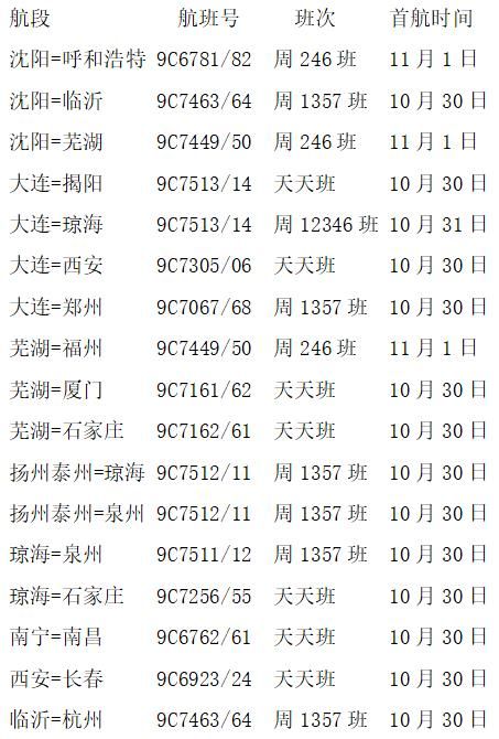 新开航线中8条航线或航段属于春秋航空独飞,填补了一些城市之间的航班空白。这些航线包括沈阳=芜湖、大连=琼海(经停揭阳潮汕)、芜湖=福州、芜湖=厦门、扬州(泰州)=琼海(经停泉州)、扬州(泰州)=泉州、琼海=泉州。