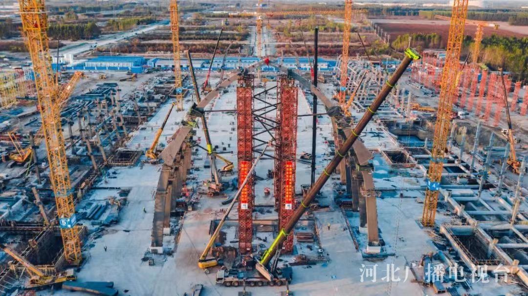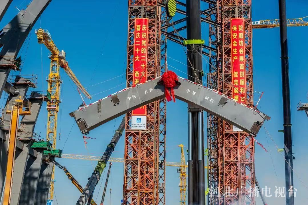 临空国际会展中心地上钢结构首跨成功合龙,为整个登录厅的钢结构安装提供了经验数据支撑,是登录厅整体施工进度保障的前提。接下来,廊坊临空经济区将全力冲刺钢结构吊装整体完成任务节点,早日建成国际一流会展平台。