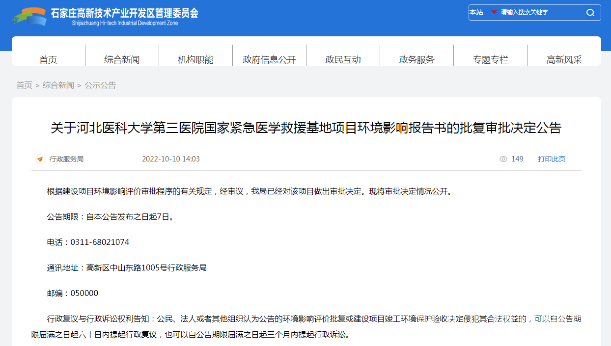 此前,石家庄高新区行政服务局曾于今年7月发布消息,对河北医科大学第三医院国家紧急医学救援基地项目环境影响报告书进行公示。