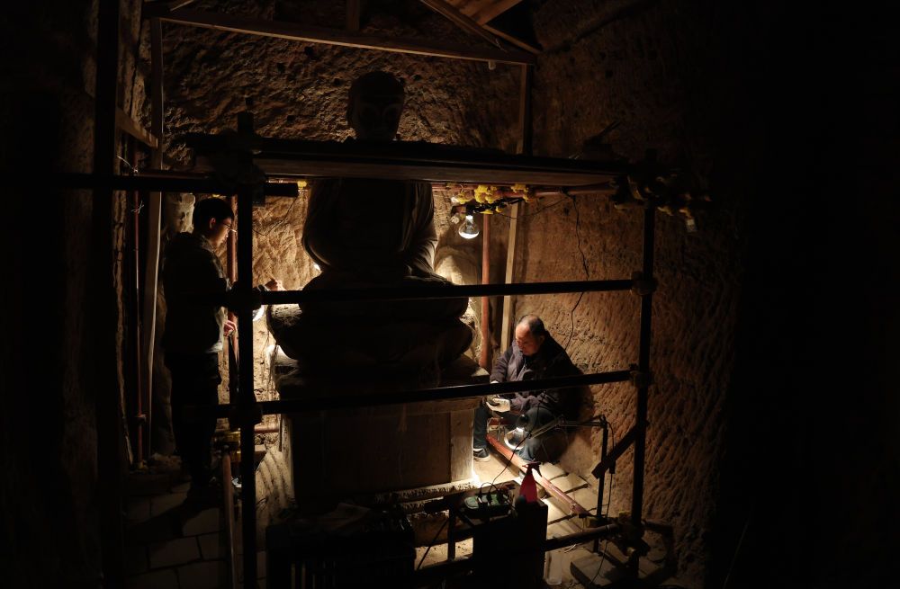 2024年11月2日,麦积山石窟艺术研究所保护研究室的文物修复师何举在麦积山石窟133窟内修复塑像。近年来,麦积山石窟艺术研究所等文物保护部门持续加大对麦积山石窟的抢救性保护和预防性保护工作力度,积极探索现代科学技术手段与传统文物修复技艺相结合的保护修复新路径。截至目前,麦积山石窟已有80个洞窟完成整体保护修复工作。