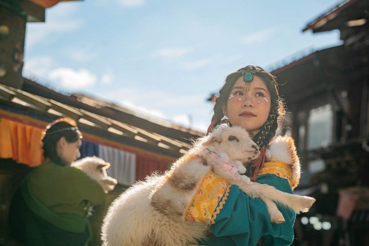 2023年3月8日,游客在迪庆藏族自治州香格里拉市独克宗古城拍照留念。