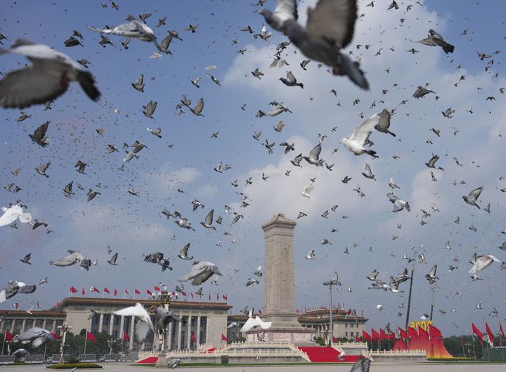 2025年9月3日,纪念中国人民抗日战争暨世界反法西斯战争胜利80周年大会在北京隆重举行。这是纪念大会现场放飞鸽子。新华社记者 牟宇 摄
