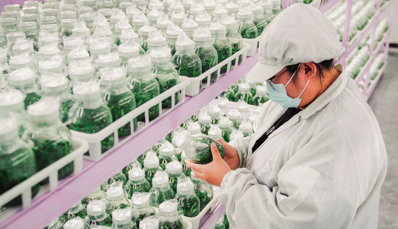 在位于吉林省公主岭市范家屯镇的恒通生态农业科技开发有限公司,工作人员在培育室内观察花卉幼苗生长情况(2025 年 3 月 19 日摄) 许畅摄 / 本刊
