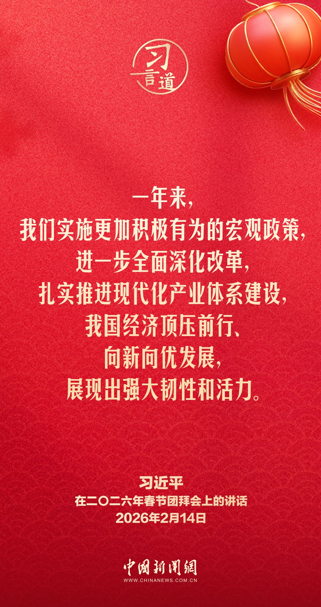 2月14日,中共中央、国务院在人民大会堂举行2026年春节团拜会。中共中央总书记、国家主席、中央军委主席习近平发表讲话,代表党中央和国务院,向全国各族人民,向香港特别行政区同胞、澳门特别行政区同胞、台湾同胞和海外侨胞拜年。他指出——