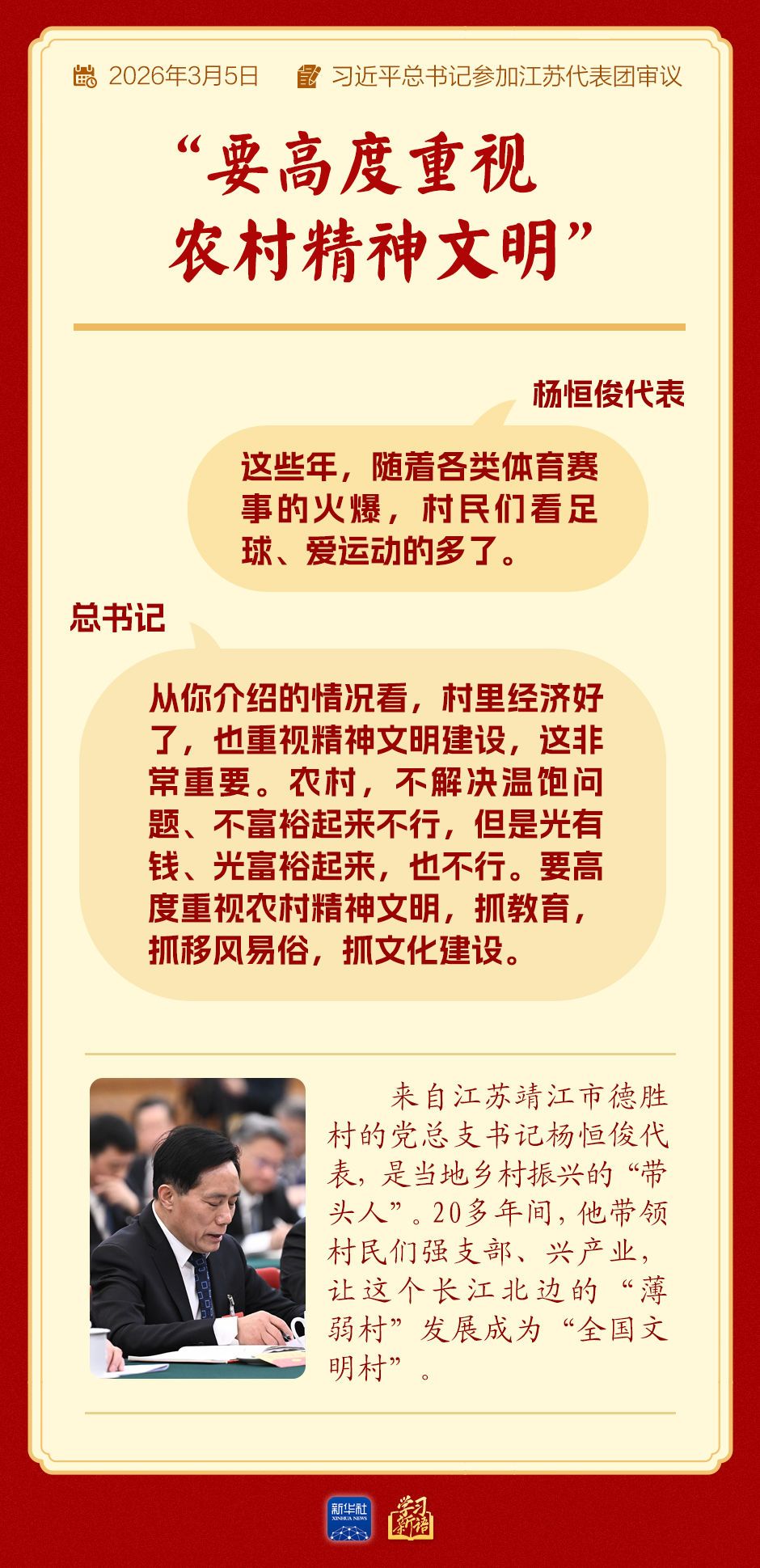 总书记强调:“从你介绍的情况看,村里经济好了,也重视精神文明建设,这非常重要。农村,不解决温饱问题、不富裕起来不行,但是光有钱、光富裕起来,也不行。要高度重视农村精神文明,抓教育,抓移风易俗,抓文化建设。”