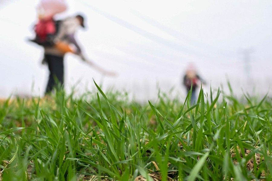 2026年2月4日,农民在江苏省昆山市锦溪镇长云村麦田间喷打化肥。新华社发(王须中摄)