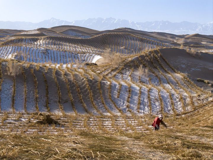 施工人员在甘肃省酒泉市阿克塞哈萨克族自治县的库姆塔格沙漠铺设沙障(2025年12月13日摄,无人机照片)。新华社发(高宏善摄)