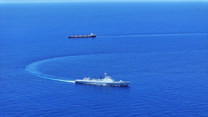 中国海军第46批护航编队焦作舰(下)护送货船至解护点后与之分航(2024年5月7日摄)。新华社发(张大禹 摄)