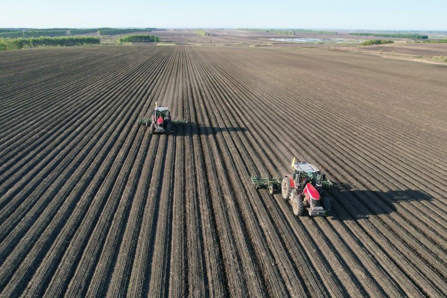 2025年5月23日,在北大荒集团黑龙江建设农场有限公司第三管理区,农机工人驾驶搭载北斗卫星导航自动系统的大型中耕深松机械,对刚出苗的玉米地块进行深松放寒作业(无人机照片)。新华社发(许颖献摄)