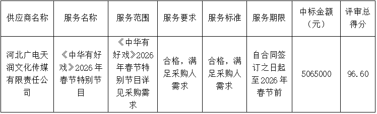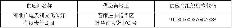 2.本项目中标人为联合体投标,联合体牵头人:河北广电天润文化传媒有限责任公司;联合体成员:河北奥世星空文化传媒有限公司、石家庄市闪凝文化传播有限公司、河北影视集团天速电视剧制作有限公司、河北海之光文化传媒有限公司。
