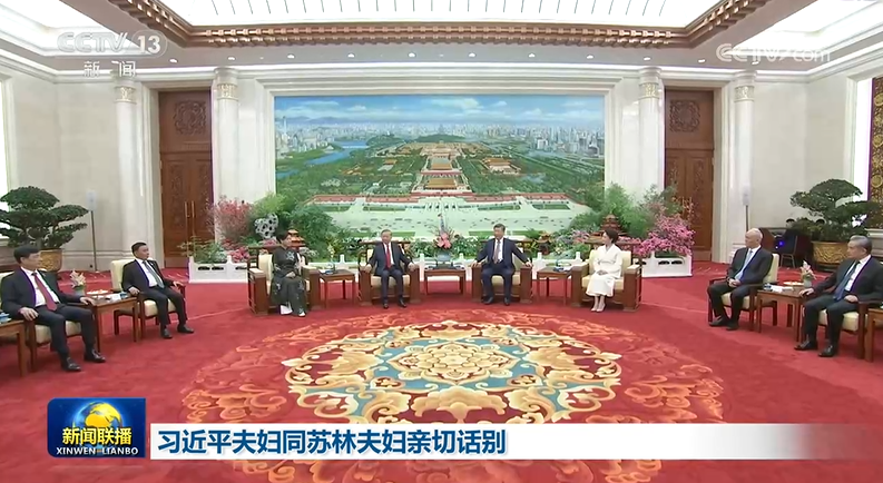 4月15日下午,中共中央总书记、国家主席习近平和夫人彭丽媛同来华进行国事访问的越共中央总书记、国家主席苏林和夫人吴芳璃亲切话别。