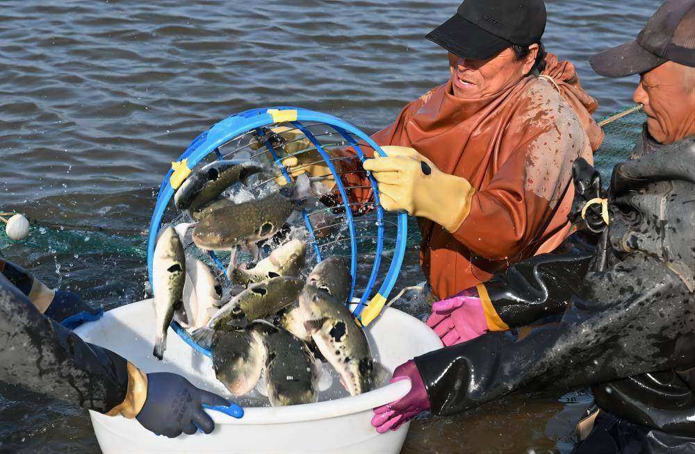 唐山市曹妃甸区一家河豚养殖合作社的社员在捕捞河豚。(资料片)新华社记者杨世尧摄
