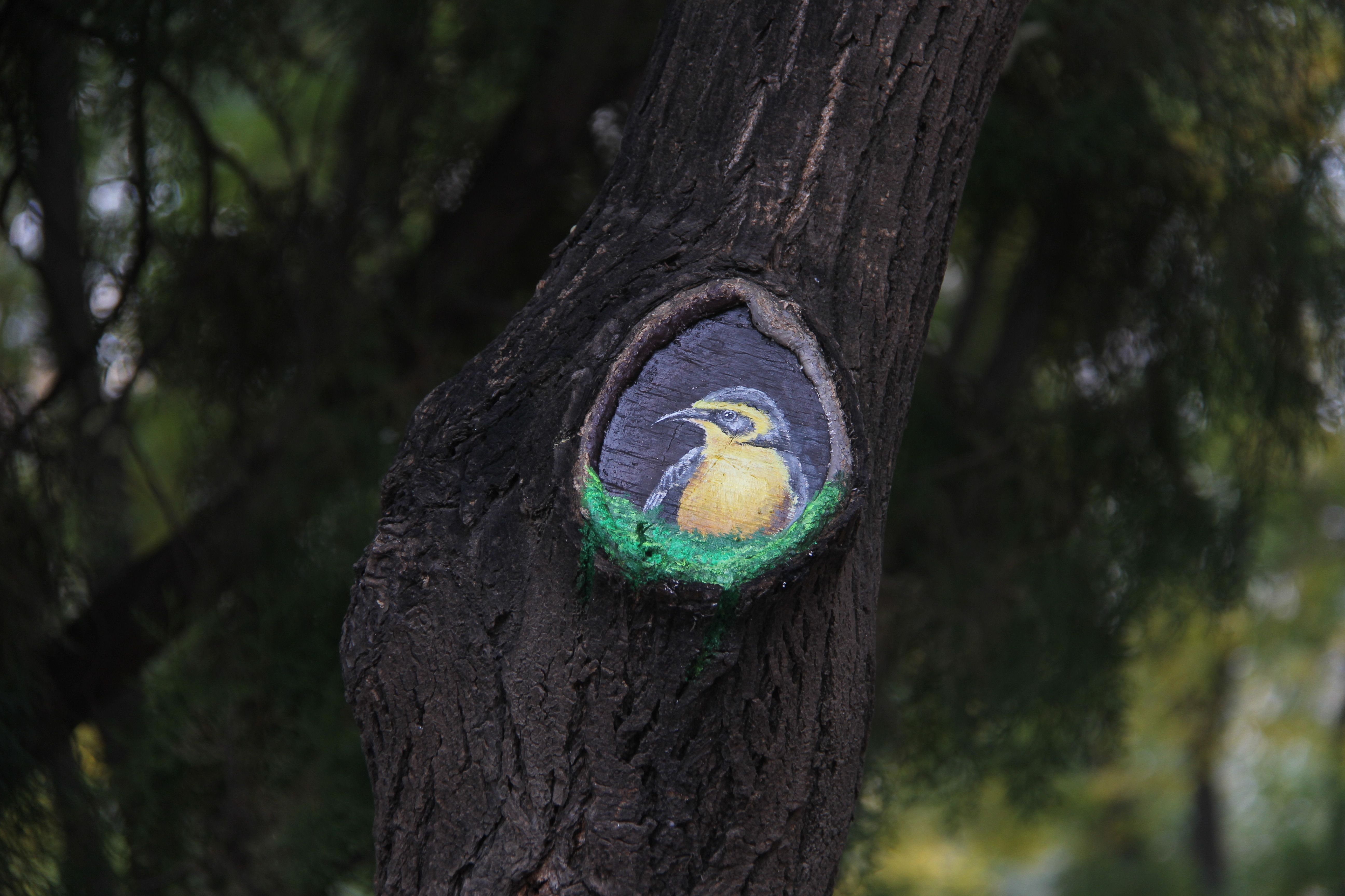 除了这只“小鸡”,小鹦鹉、小狐狸等形象也纷纷“藏身”树洞,不少人停下脚步,拍照欣赏。不远处,志愿者们正俯身执笔,让原本沉寂的树洞焕发出艺术的温度,让这里的树洞成为市民逛街时的意外惊喜。志愿者王若昀说:“一些树木因年久或外力因素形成了大小不一的树洞,我们希望让这些‘受伤’的树木重新焕发生机!”