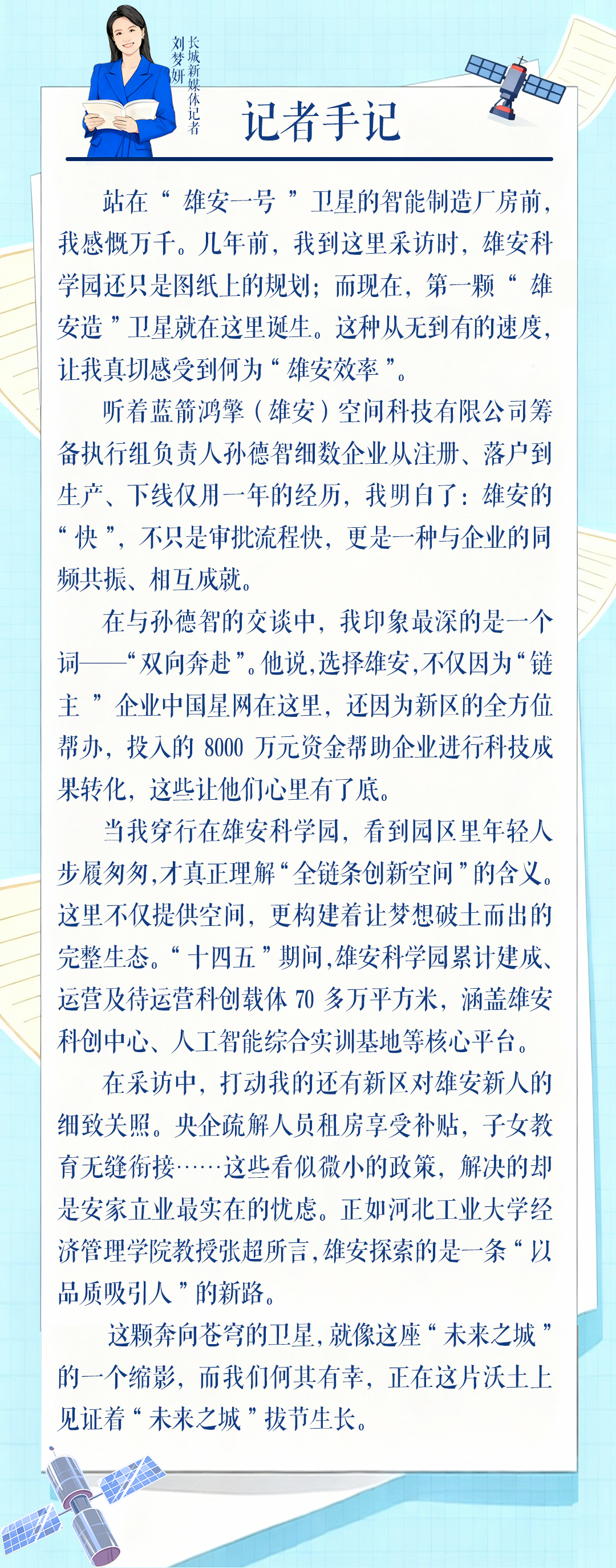 还有一个速度,同样令人惊叹。雄安鸿擎科技2025年初才在雄安注册,就实现了当年建设、当年产线投产、当年卫星下线。