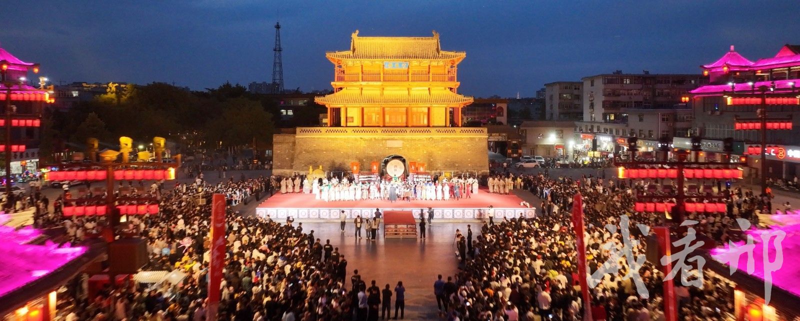 清风楼前,游客正在观看实景情景剧。资料图片