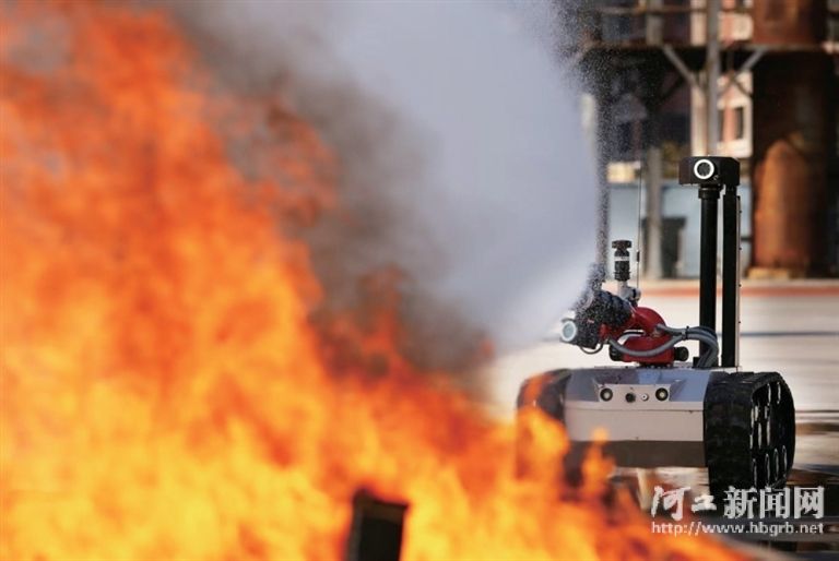 12月9日,消防灭火机器人在唐山市消防救援支队特勤大队训练场上进行灭火演习。该机器人水炮喷水量每秒80升,射程85米,作业效能相当于8名消防员的救援工作量。
